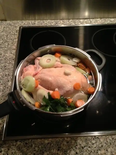Tavugumuzu iyice yikiyoruz.Duduklu Tencereye koyup uzeri gececek kadar su ilave ediyoruz.Soganlari halka halka kesip, havuclari kaziyip ayni sekilde dogruyoruz.Sarimsagi yikayip kabuklariyla beraber ortadan ikiye bolup, kekik, kereviz yapragi ve karabiber ile tavugumuza ekliyoruz. En az 30 dk duduklude pisiriyoruz.