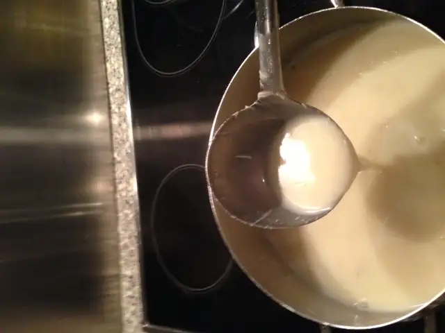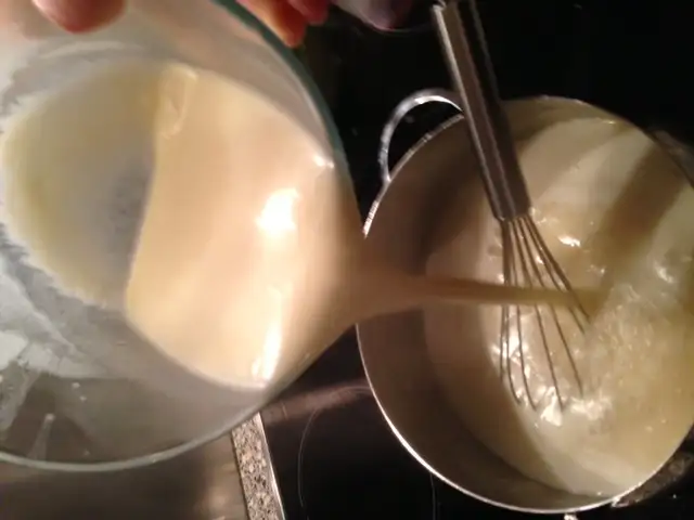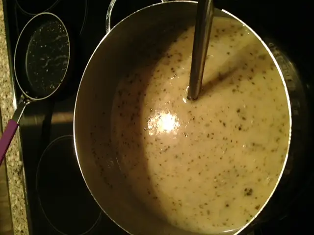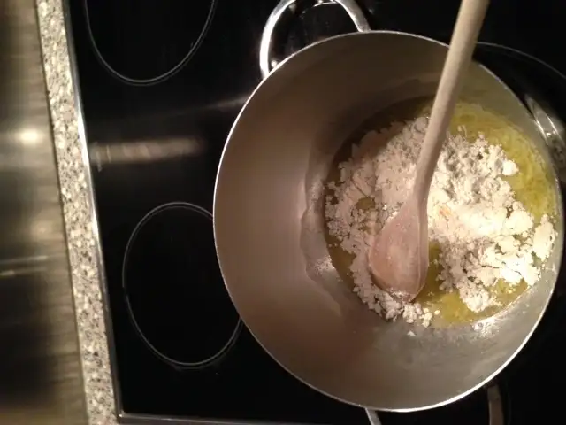daha sonra tavuk suyumuzu yavas yavas kavrulan unumuza ekliyoruz,topaklanma olmamasi icin blendar'dan geciriyoruz.
