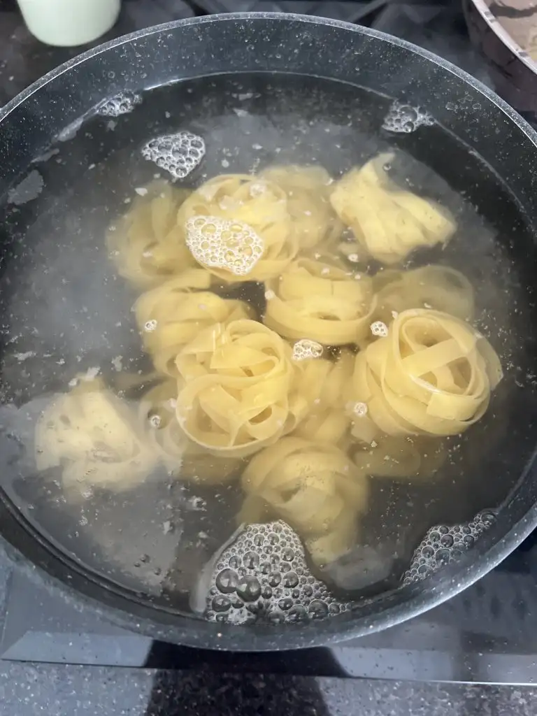 Pişen tavukları bir kenara alalım. Diğer tarafta kayanayan suya makarnaları ilave edelim. Üzerinde belirtilen pişme süresinden 1 dakika evvel makarnaları süzelim. Sosla birlikte pişecek.