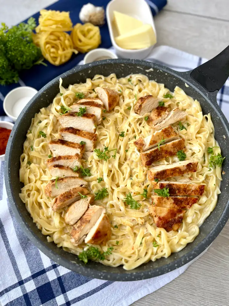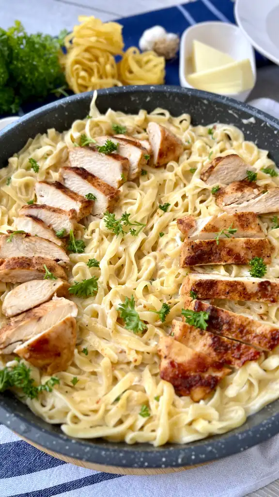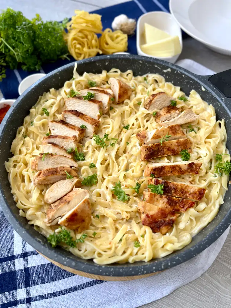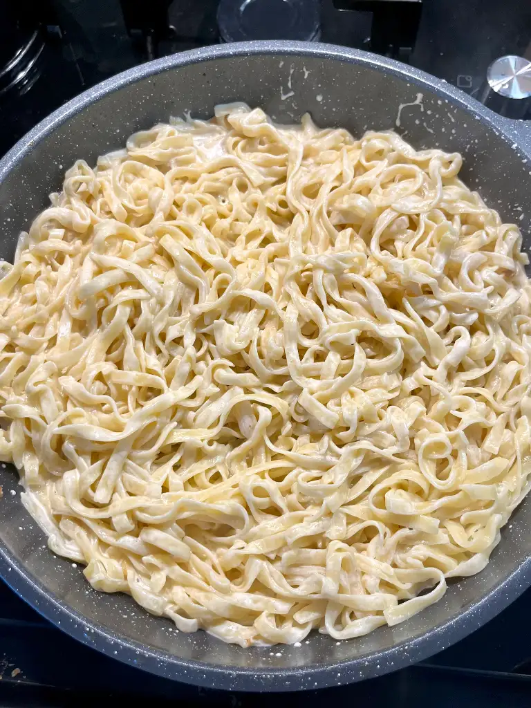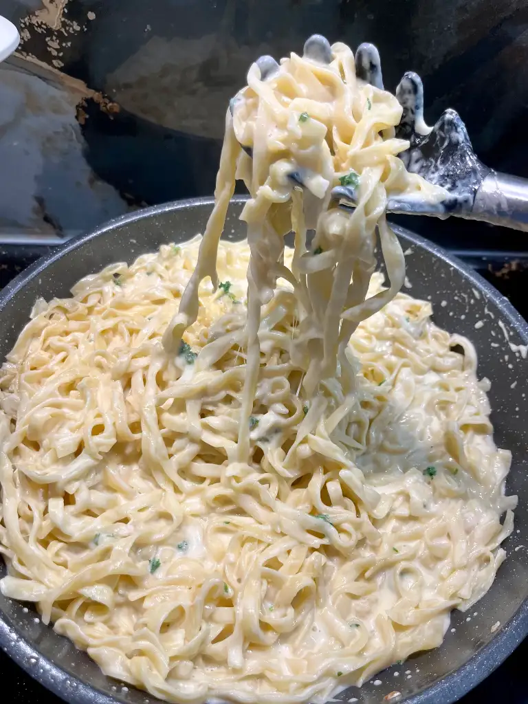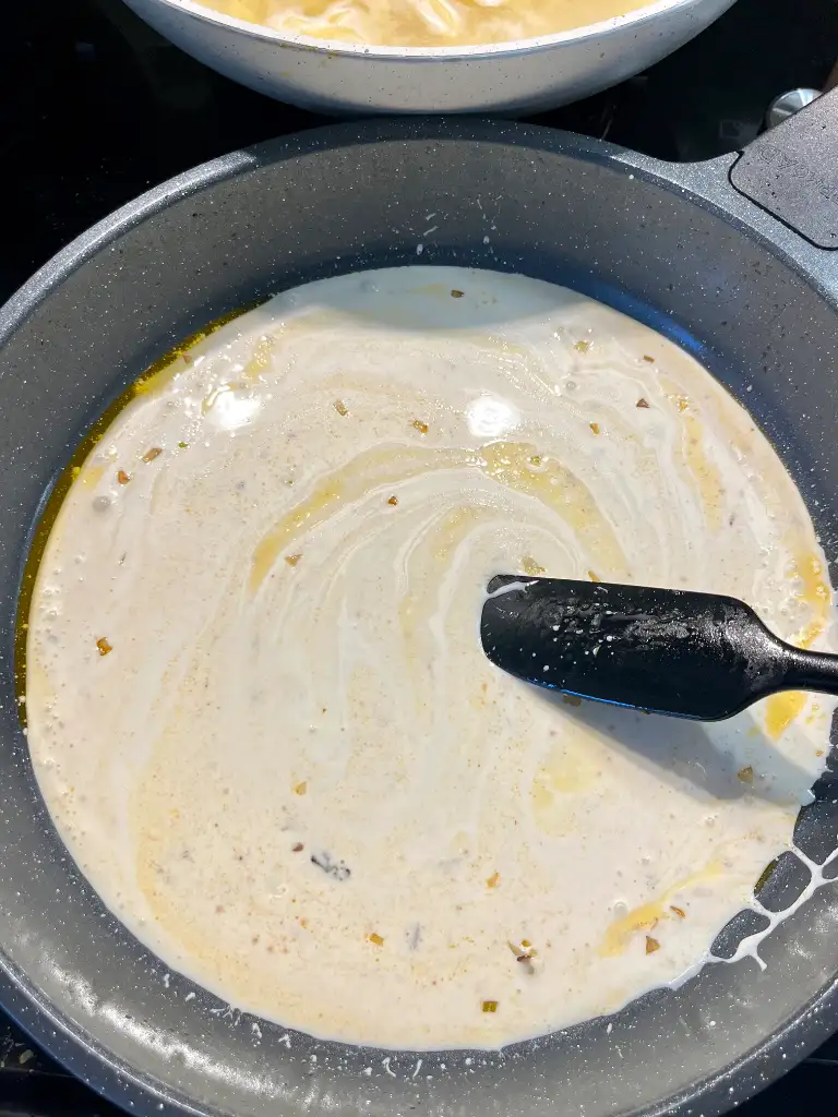 Tavukları kenara alıp ince kıyılmış sarımsağı hafif kavurup kremayı ilave edelim. 1 su bardağı makarnanın suyundan ekleyelim Eki Görüntüle 3577740 Eki Görüntüle 3577741