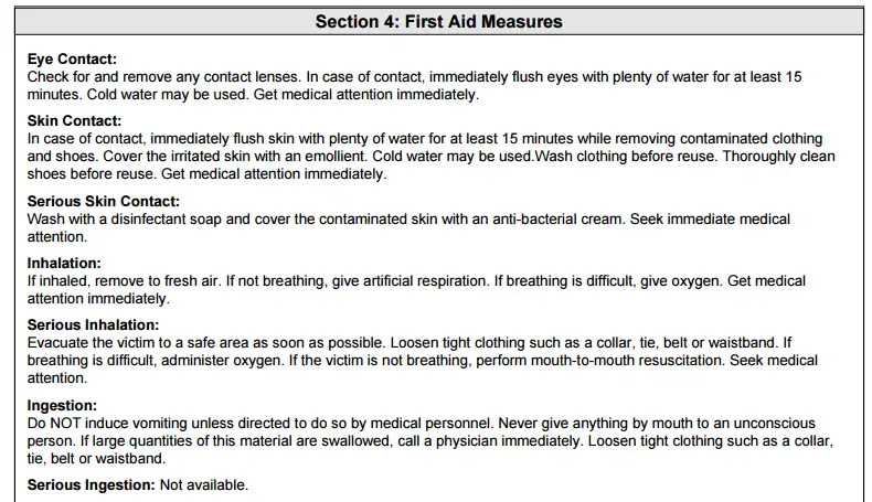 Skin Contact: In case of contact, immediately flush skin with plenty of water for at least 15 minutes while removing contaminated clothing and shoes. Cover the irritated skin with an emollient. Cold water may be used.Wash clothing before reuse. Thoroughly clean shoes before reuse. Get medical attention immediately.