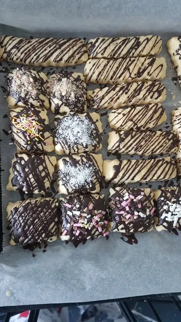 uzun olanlarin sadece uclarini batiriyorum bazende cikolataya sonra sus dokuyorum ya da uzerini komple cikolataya batiriyorum ustu cikolata ici biskuvi kahvenin yanina cok yakisiyor canim.