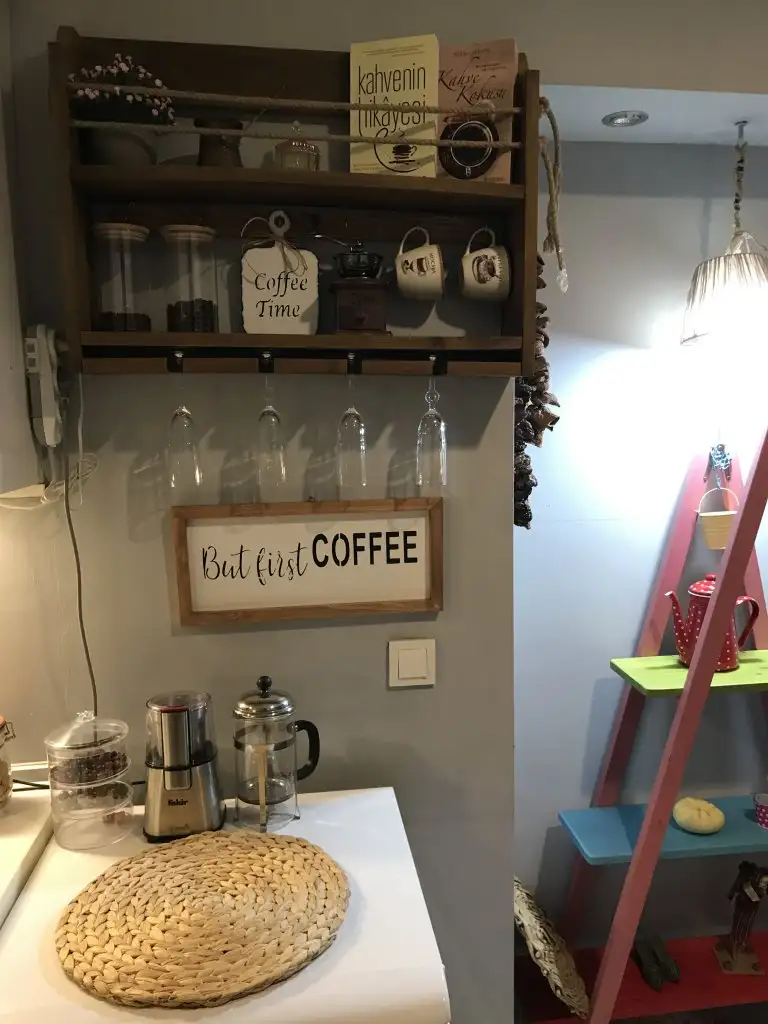 Yaa güle güle kullanın çok güzel,yandaki renkli rafa da bayıldımİftardan sonra duvar dekor, kahve köşemizi yaptık. Nihsyet oldu.ancak geldi malzemeler. Şimdi bir tek yan kısma asacağım fincan resmi panosu kaldı onu da alırım bugün.