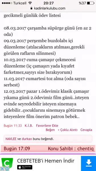 Çok güzel olmuştu o arada misafirler geldi ikram ,muhabbet yolcu etme mutfağı eski haline getirme ikindi namzı kılma , kızı okuldan alma eve geçme evden kaçar gibi çıktığım için evi toplama biraz dinlenme yemek faslı ,kocayı yolcu ettim komşuya çay içmeye gitme, geri dönüp WC yıkama ,mutfağı toplama yatsıyı kılma ,dinlenme arada etrafı toplama biraz kızla didişme koca eve geldi azıcık yemek yeme tekrar mutfağı toplama çıkan bulaşıkları yıkama kocaya bitki çayı yapma biraz el işi ayyyy