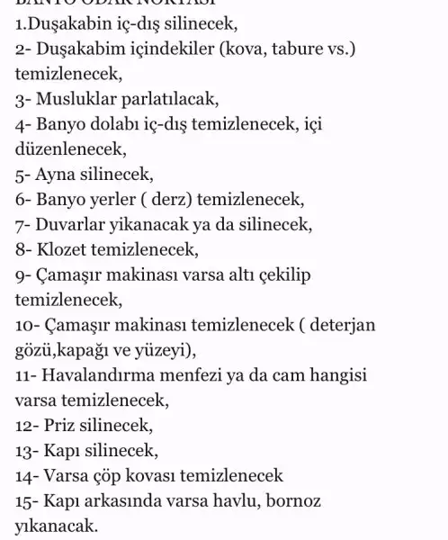 2- Duşakabim içindekiler (kova, tabure vs.) temizlenecek, +