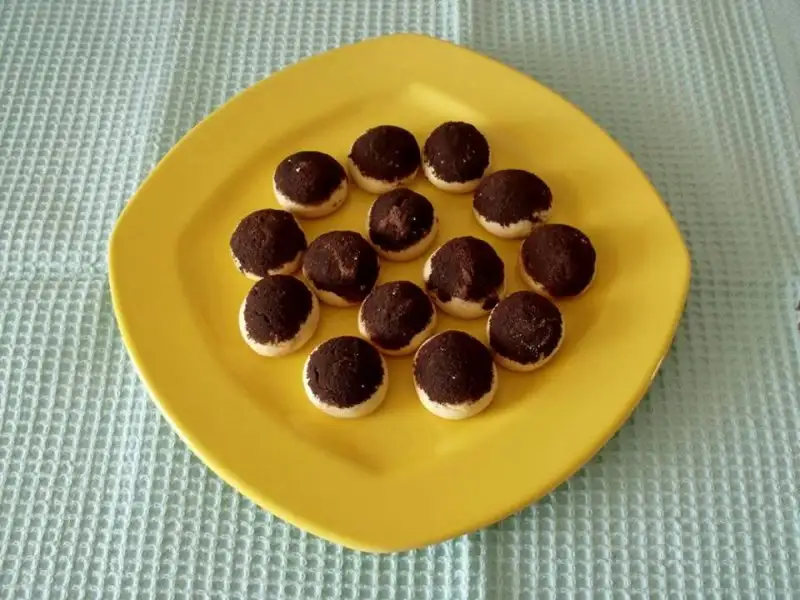 Yoğurduğunuz hamurdan ceviz büyüklüğünde parçalar alarak elinizle yuvarlayın.Önceden ısıtılmış 180 derece fırında hafif pembeleşene kadar pişirin.Fırından çıkıp, ılıyan kurabiyeleri pudra şekeri ve kakao karışımına bulayın.Afiyet olsun