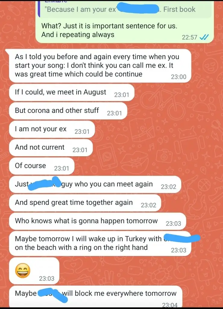 Bu bahsettiğim 4,5 yıllık bir süreç. Çok çok her yerden engelliyorum ,yazmıyorum falan. Ama o bir şekilde ulaşıyor,bir uygulamadan,mailden falan. O yazınca karşı koyamıyorum hemen sazan gibi atlıyorum.