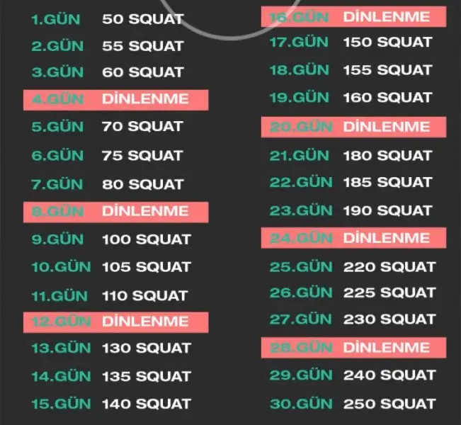 Tabi ki bu hareketleri uygularken beslenmenizi de düzene sokarsanız çok çok daha iyi sonuç alırsınız ayrıca kendinizi fazla zorlamamalısınız. Her hangi bir sorun veya zorlama hissederseniz sayıları azaltıp form tuttuktan sonra 30 günlük döngüye girerseniz daha iyi olur ama acı yoksa sonuç da yok. Tabi ki ileri seviye zorlamalardan bahsetmiyoruz böyle durumlarda direkt olarak doktorunuza görünmenizde fayda var. İlk zamanlar hamsanız bacaklarınız ağrıyabilir. Bu sebeple bu bir meydan okuma. Pes etmeyin ve 30 günü tamamlayın pişman olmayacaksınız.