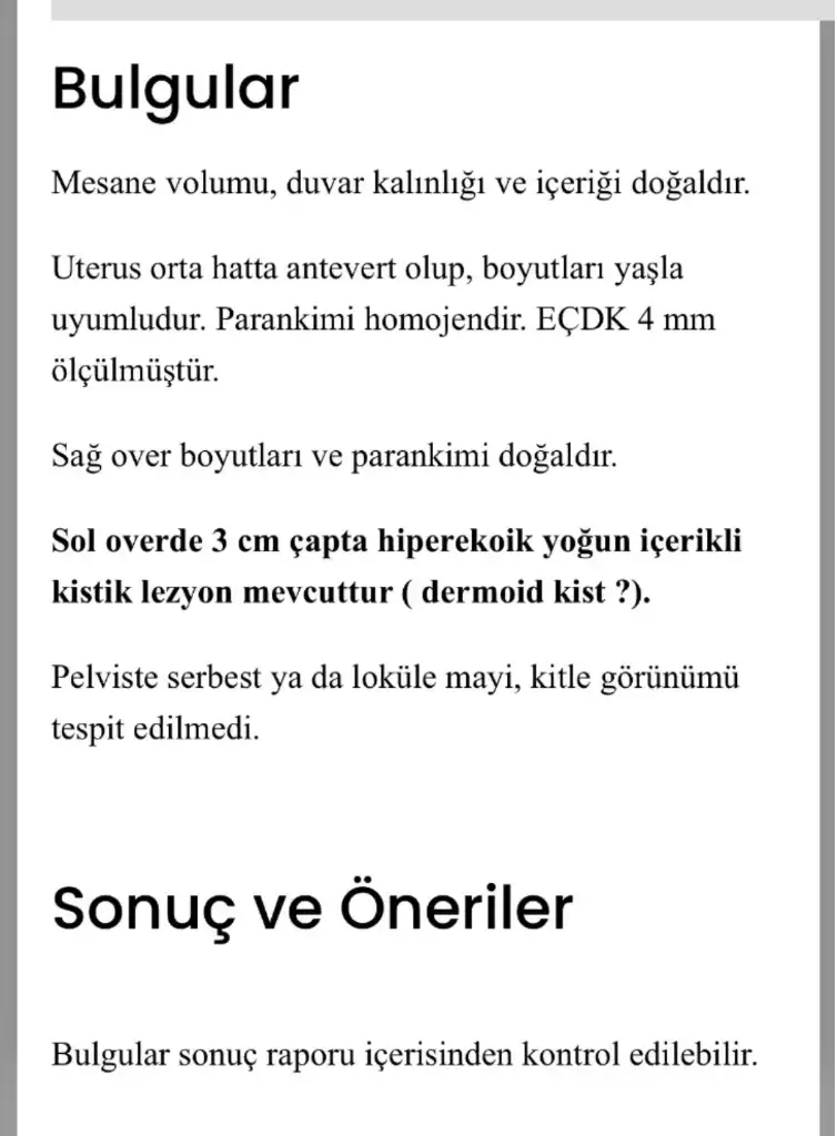 15 mayısta aşılamayla 31 mayısta hamile olduğumu öğrendim. Kese var bebek görünüyor görünmüyor derken 19 Temmuz’da boş gebelik sebebiyle kürtaj oldum, şu an başka bir ildeyim kontrole gittim en son radyolojide yapılan muayenede aşağıdaki sonucu aldım, doktorun çektiği ultrasonda da net bir şekilde görünüyor, doktor izne ayrılmış sonuçları gösteremedim, daha kendi doktoruma görünmeme de epey vakit var yine içime bir kurt düştü. Başına gelen veya bu durumu anlayabilen varsa yorum yapabilirse sevinirim