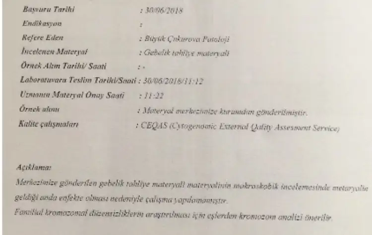Canım duydum ve çok üzüldüm.öncelikle çok geçmiş olsun.benimde düştüğüm genetiğe gönderildiğinde genetik doktoru bebeğin kalbi duralı çok olduysa sıvı içinde cansız durmasından dolayı kromozom inceleme işleminin yapılamayacağının bebeğe ait dokunun üreme yapmama ihtimalinden bahsetmişti.senin öyle olmuş yani bebek canlılığını yitireli çok olunca hücre bölünmesi olmamış inceleme de.Eki Görüntüle 2170561 Merhaba kızlar bende 11. Haftada doktora gittim 9+3 te bebeğimin kalbinin durduğunu öğrendik patoloji sonucum temiz çıktı bugünde genetik testimizin sonucu çıktı ama birşey anlamadım bi bakıp yorum yapabilir misiniz lütfen...
