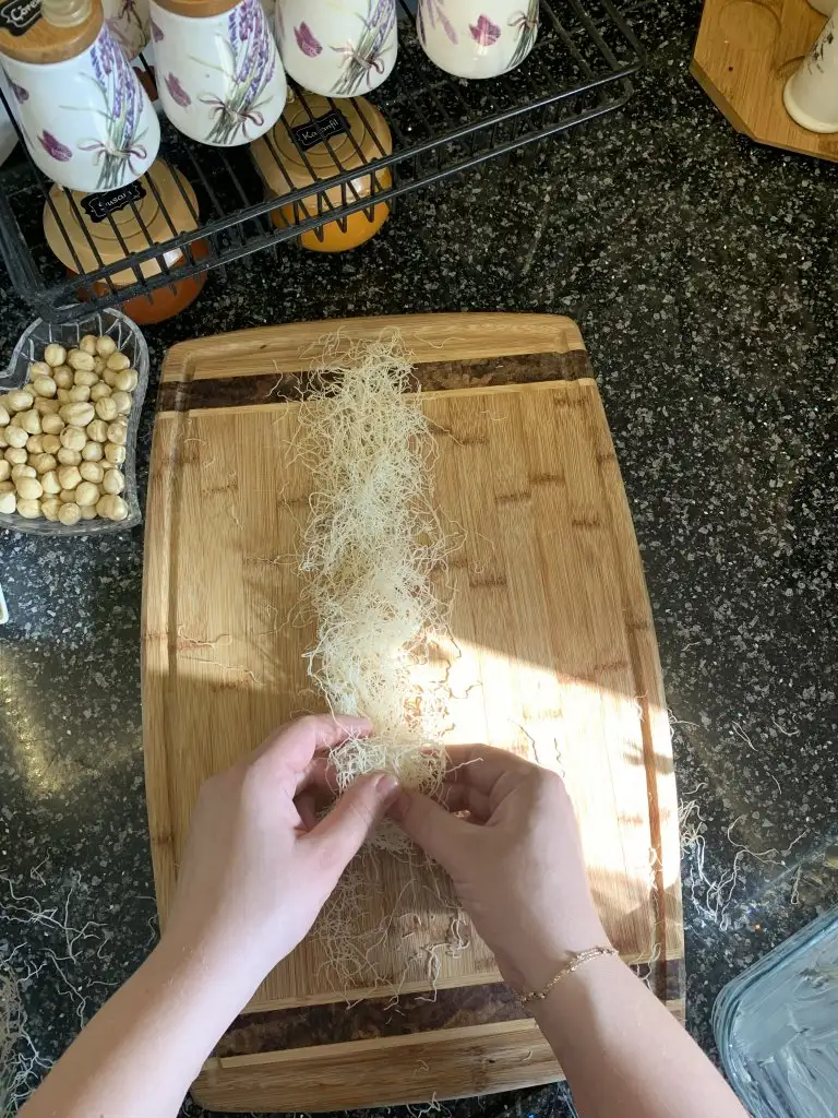 Kadayıfları resimdeki gibi uzun uzun koyup parmagımız ile yuvarlıyoruz. Ortasını çukurlaştırıp tepsimize diziyoruz. Bu arada tepsimizi tereyağı ile yağlıyoruz biraz.