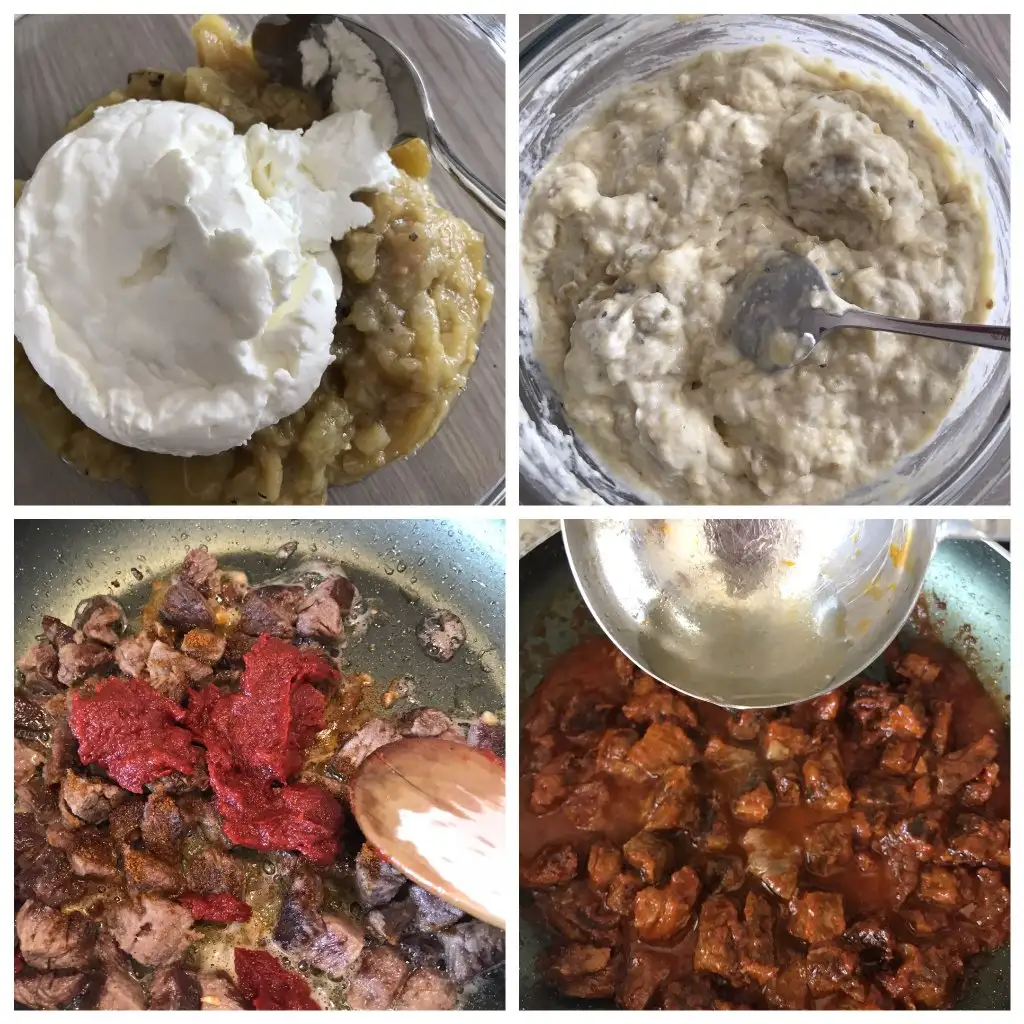 Gelelim patlıcanlı kısıma. (Ben hazır köz patlıcan kullandım. Zamandan büyük tasarruf sağladı bu iş bana. Dilerseniz siz ocakta közleyebilirsiniz.) Közlenmiş Ve doğranmış patlıcanlara süzme yoğurt, labne ve tuz ekledim. Böylece yemeğimin alt tabanı hazır bile! Veeeeee üzerine etlerimi koyarak yemeğimi bitiriyorum. Üzerine tereyağ da gezdirdik mi işlem tamamdır.işte bu kadaaaarrr