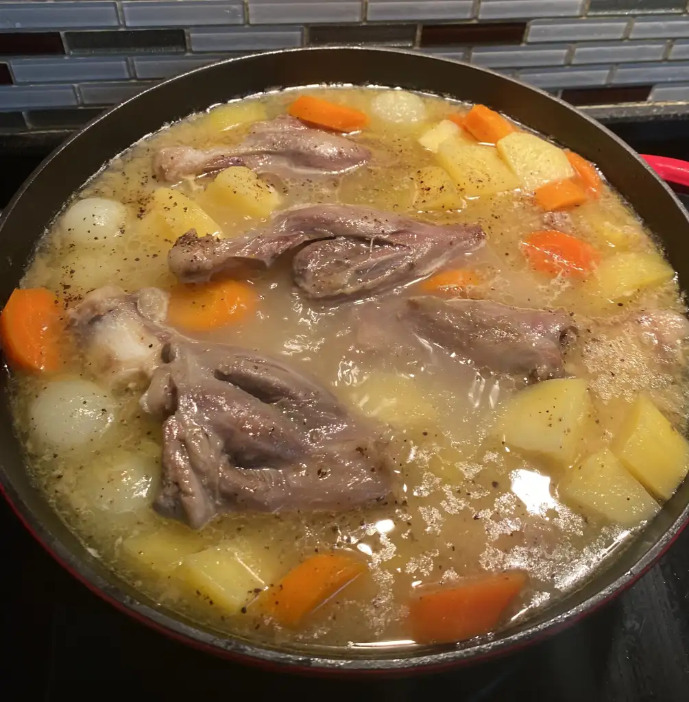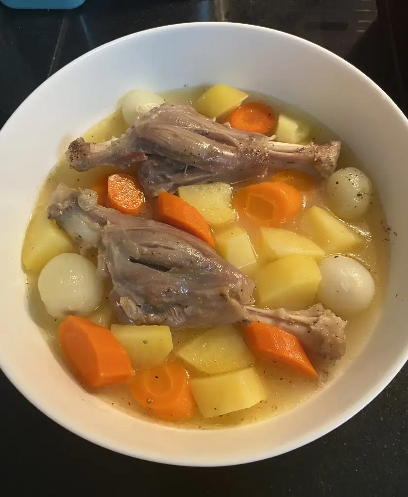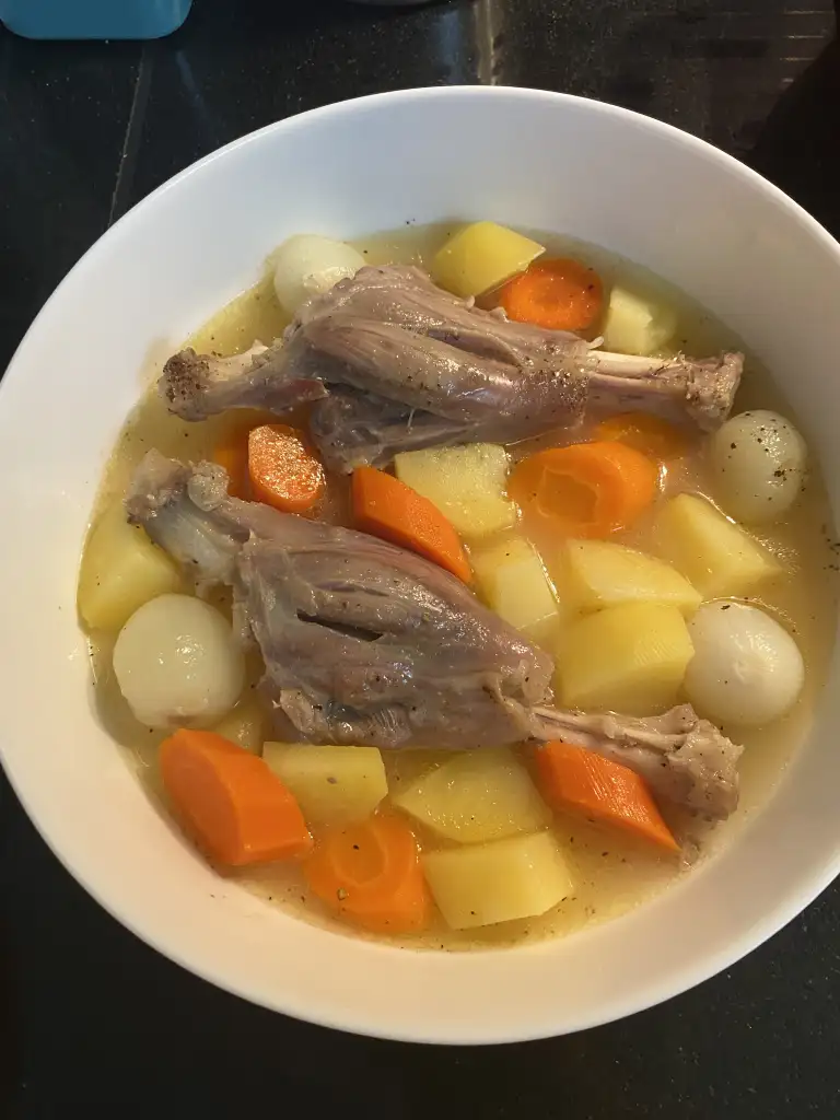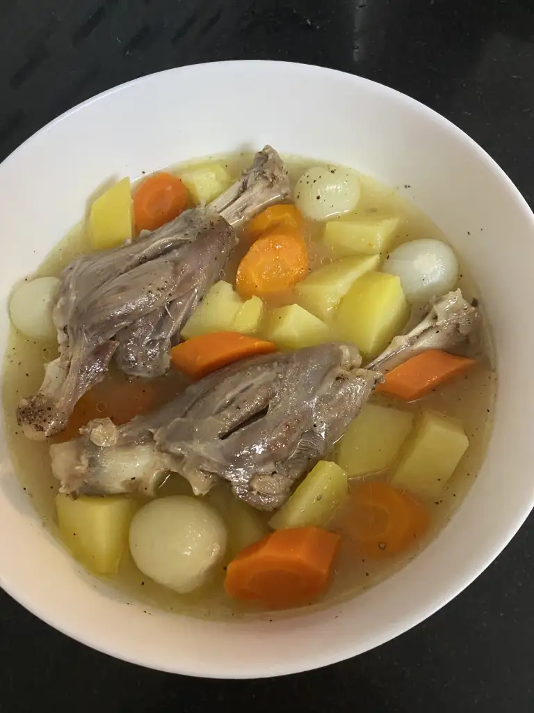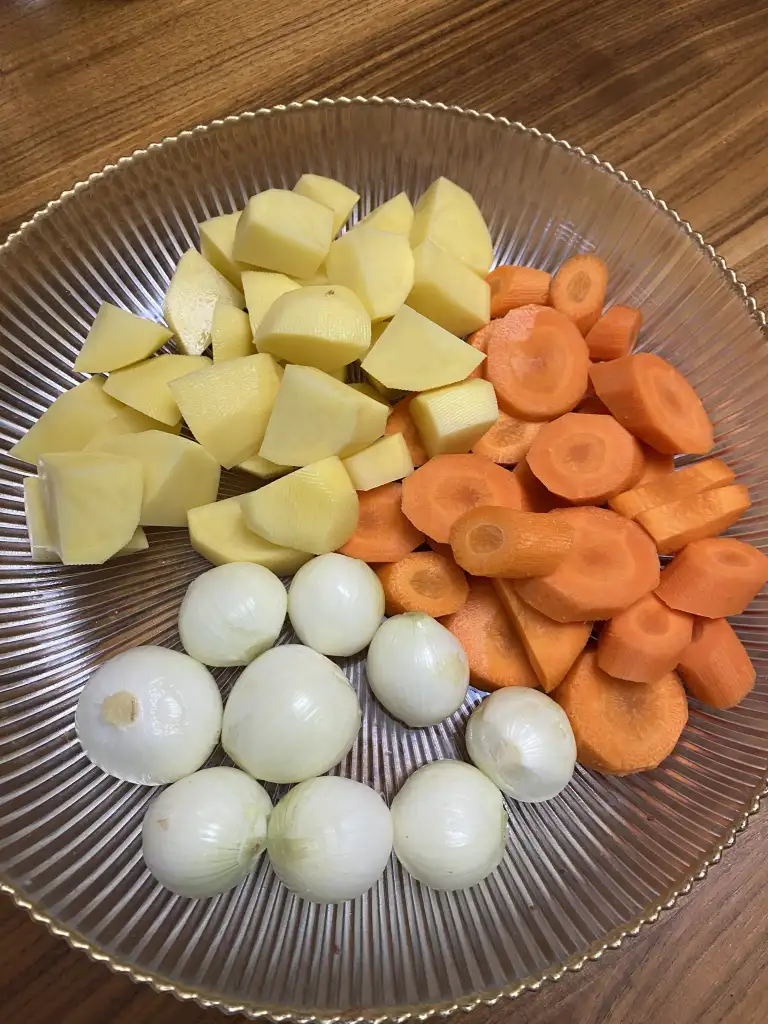 Tencereye zeytinyağını koyup altını açıyoruz, yıkadığımız etleri tencereye koyup kapağını kapatıyoruz, etlerin iki tarafını da mühürlüyoruz. Etler mühürlenince üzerine sıcak su döküyoruz ve 2 adet defne yaprağı koyuyoruz. En az 1 saat pişiriyoruz. Defne yapraklarını çıkartıyoruz. Arpacık soğanları, havuçları ve patatesleri soyuyoruz. Önce soğanları bütün olarak tencereye alıyoruz, sonra havuçları şekilli büyük büyük doğrayıp tencereye alıyoruz, en son patatesleri biraz iri doğrayıp içine ekliyoruz. Yarım saat kadar kapağı kapalı pişiriyoruz. Bir çatalla sebzeler pişmiş mi diye kontrol ediyoruz, pişmişse tuz ve karabiberi ilave edip ezilmeyecek şekilde hafif karıştırıp kapağını kapatıyoruz ki tuz buharla her yerine dağılsın. 2-3 dk sonra ocağın altını kapatıyoruz. Servis tabağına alıyoruz. Afiyet olsun.