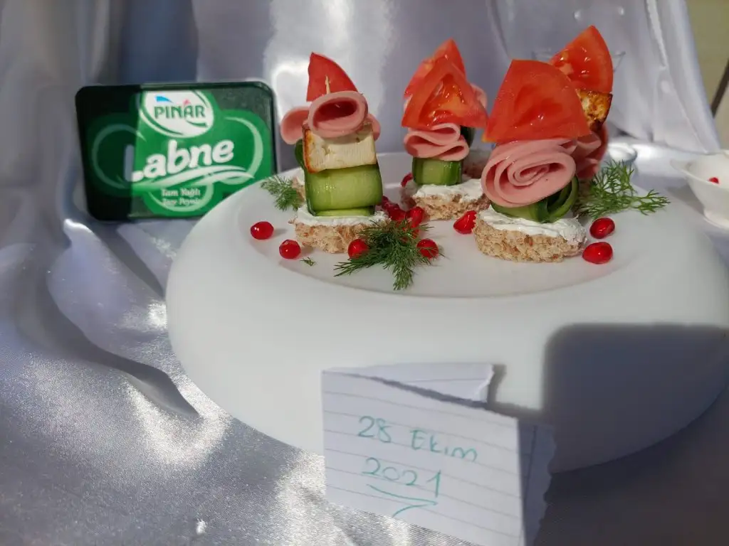 Üzerini malzemeler listesinde yazdığım malzemeleri dileğiniz şekilde kürdan ile düzenleyerek servis ediyoruz