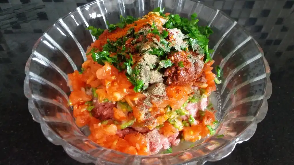 Doğradığımız maydanozu,tuzu,karabiberi,pulbiberi,kırmızı toz biberi,kimyonu ve sıvıyağı ekliyoruz.