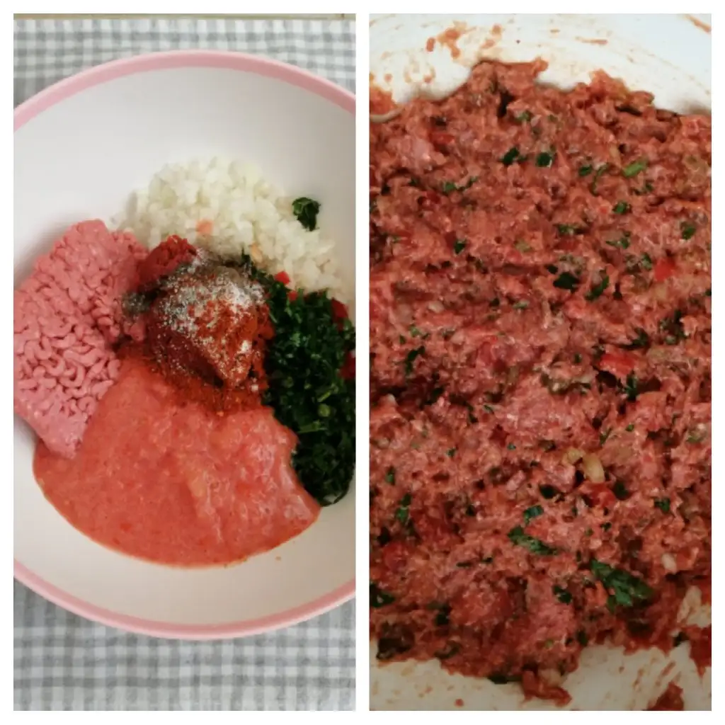 Sebzeleri ince ince kıyıyoruz. Domatesi robottan geçiriyoruz. Tüm malzemeleri karıştırıyoruz.