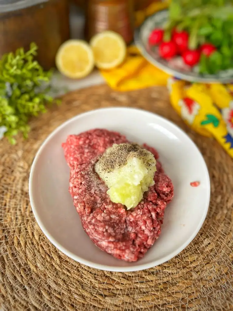 Eki Görüntüle 3520750 Kıymaya karabiber tuz ile birlikte soğanı da ilave edip yoğuralım.