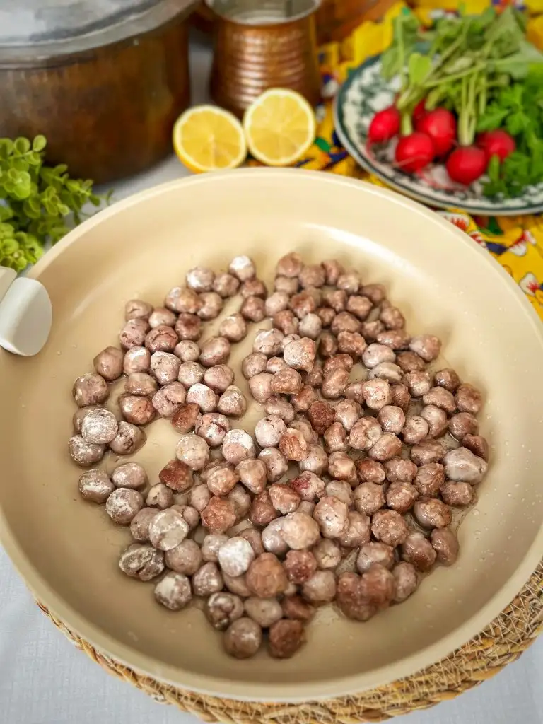 Nohut boyutunda yuvarlayıp unlanmış tabağa koyalım