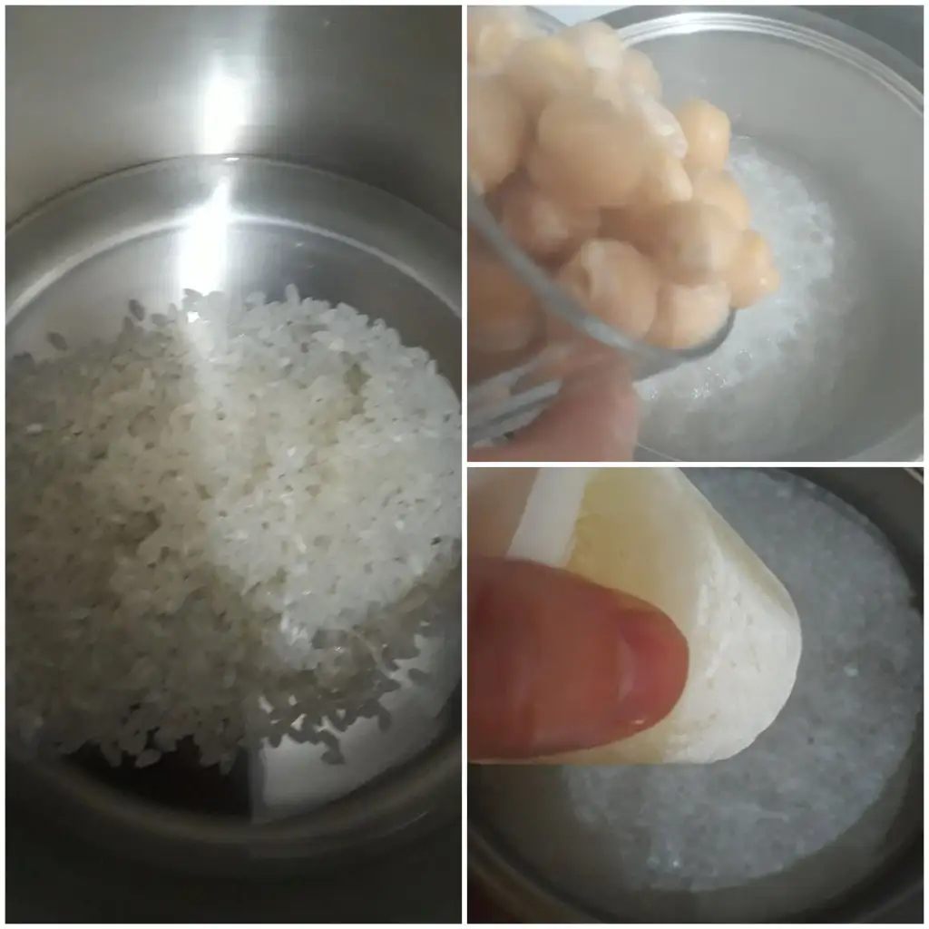 pirinci bir miktar su ile hasliyoruz. Sonra nohut,kemik suyu ve suyunu ekleyip kaynatıyoruz.