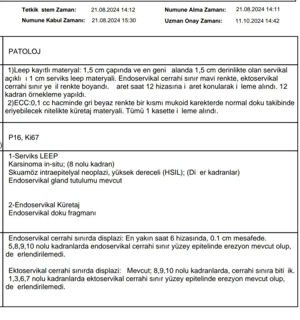 Merhaba yeni gördüm mesajınızı. Patoloji sonucunuz da gördüm. Patoloji sonucunda cin 3 çıkmış. Doktorunuz zaten sizi yonlendirecektir. Muhtemelen tekrar leep önerebilir ama doktor daha iyi bilir tabi. Cerrahi sinir pozitif çıktığı için sürecin devamlılığını anladım. Umarım kısa sürede hallolur çok çok geçmiş olsun.Merhaba biri banada yardımcı olabilirmi rica etsem