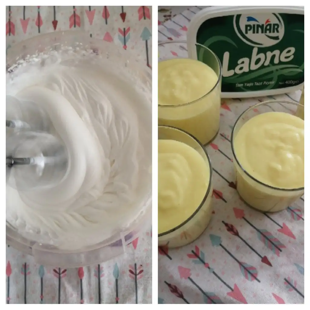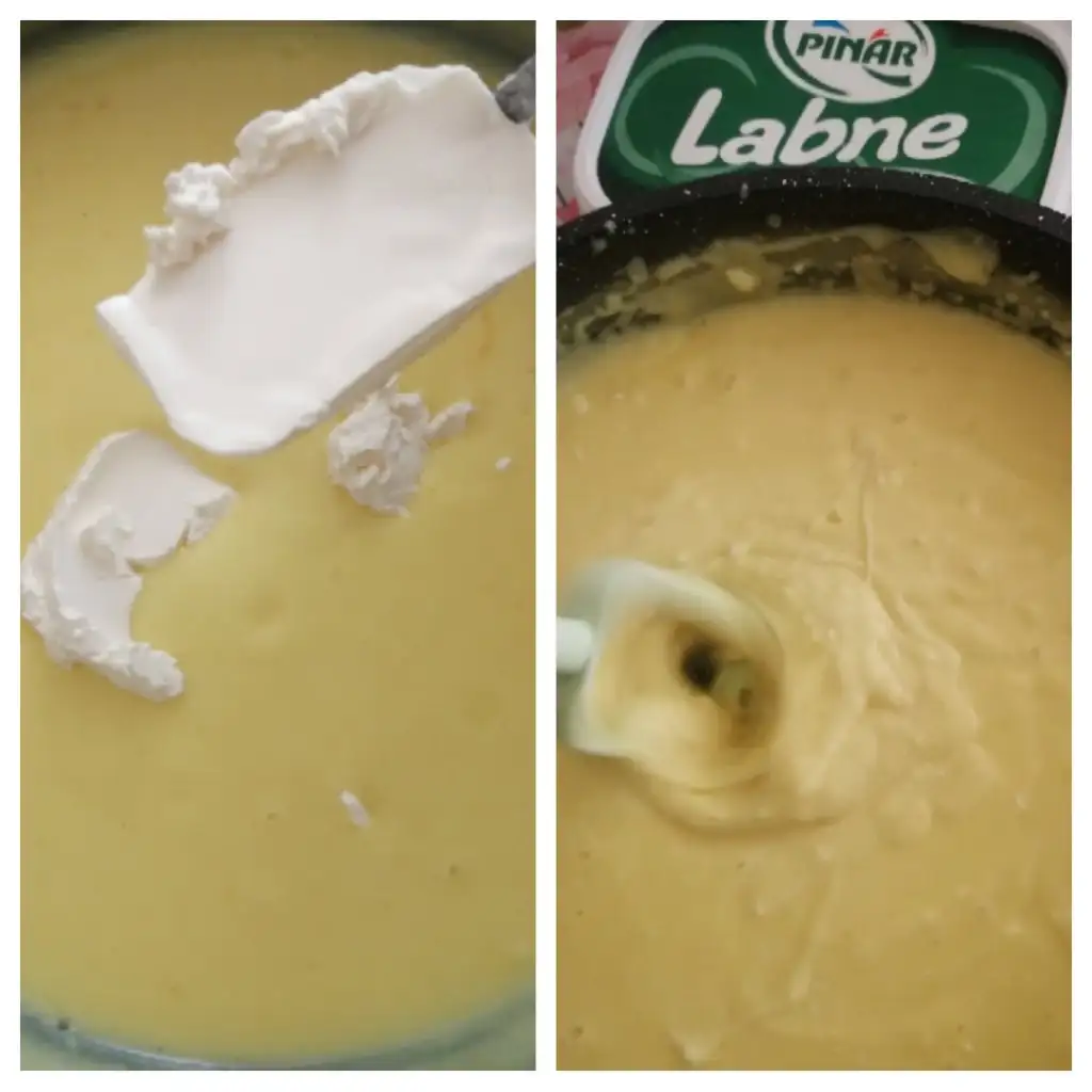 Pişen muhallebinin içine 3 yemek kaşığı Pınar Labne ekleyip mikser ile çırpıyoruz.