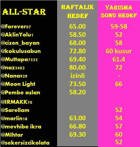 Ya benim için haftakik hedef çok zor.. çünkü benim 55 kilo yıllardır üzerime oturmuş kilo. Mesela bu Çarşamba 55 olurum ama.. 55 54 ten sonrasi çok zor gidiyor. Yillardır oturan kilo olduğu icin