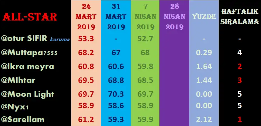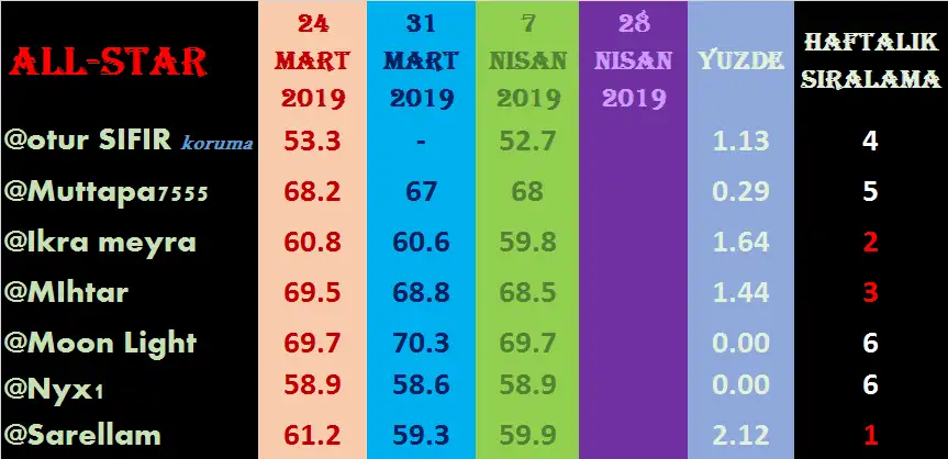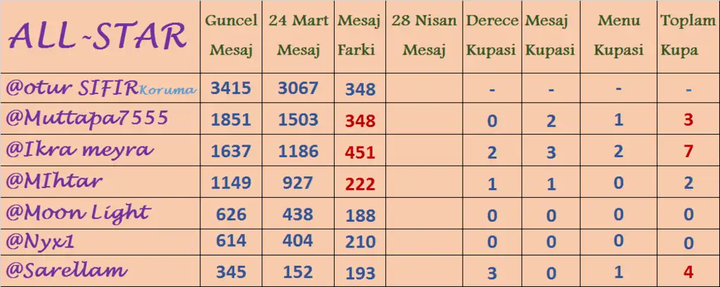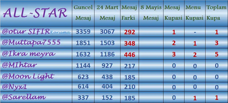 Mesajlar 6 haftalik. 8 mayis sonuna kadar 600 mesaj yazilacak. Tablo artik mesaj sayisina gore duzenleniyor. En cok mesaj sayisi olan en ustlerde yer alir.
