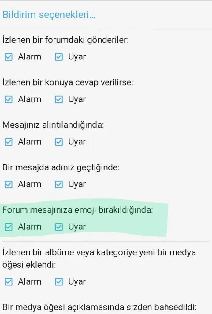 Tamam abla yapayımSadece beğenileri kaldıracaksin diğer bildirimler normal gelir. Profilinden forum seçeneklerine giriyorsun orada yapılıyor. Uyar tikini kaldır. Yeşil ile işaretli alandaki