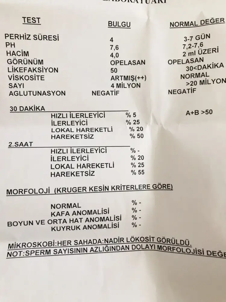 Arkadaşlar bugün sperm testi verdik doktor bu değerlere göre normal yolla bebek olması düşük dedi lütfen sizde bir bakın anlayan arkadaşlar