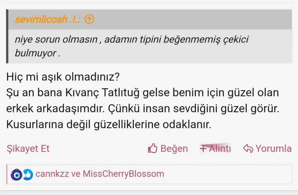 Şu an bana Kıvanç Tatlıtuğ gelse benim için güzel olan erkek arkadaşımdır. Çünkü insan sevdiğini güzel görür. Kusurlarına değil güzelliklerine odaklanır.
