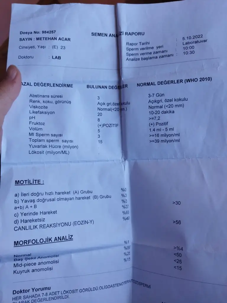 Hacamati hastanedemi yaptırabilirizBizde de ileri hareket 0 ama yerinde hareket 42 cıktı o yüzden doktorlar normal diyorlar ikisinin toplamının en az 40 olmasi gerektiği için biz bunun için proxeed plus kullanıyoruz hem sperm sayısına etkisi var hem de harekete incir kurune de basladik hacamatta yaptirdik bakalim yeni testte nasıl olacak