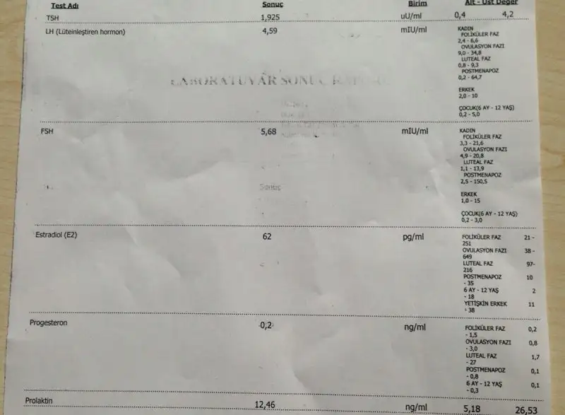 Sonuclarin cok guzel bence ne icin gitmistinki doktoraHormone to Test Hormon TestiTime to Test Test ZamanıNormal Values Normal DeğerDeğerler ne ifade ediyorFollicle Stimulating Hormon (FSH)Adetin 3. günü3-20 mIU/mlFSH değeri sık sık yumurtalık rezervinin bir ölçüsü olarak değerlendirilir.Genel olarak FSH değeri 6’ nın altında ise mükemmel , 6-9 arası ise çok iyi , 9-10 ise oldukça iyi, 10-13 ise rezervde azalma var,13 üzeri ise uyarılma çok zor demektir.LH:FSH oranı ,PCOS (Polikistik over sendromu) için bir tanı değeri olarak kullanılabilir. Ve bu oran genellikle 1:1 oranındadır , ama eğer LH büyük ise olası bir PCOS göstergesinden söz edilebilir.Estradiol (E2)Adetin 3. günü25-75 pg/mlKüçük değerler uyarılmaya daha meyilli olunduğunu gösterir. Adetin 3. gün E2 değerinin çok yüksek çıkması , fonksiyonel bir kist veya yine yumurta rezervinin azalması göstergesiolabilir.Estradiol (E2)Uyarılmanın 4-5 Günü100+ pg/ml or 2×3. günUyarılma sırasında E2 değerlerinin kaç tane folikül oluşuğuna ve onların büyüklüklerine bağlı olarak geniş bir dağılım gösterdiklerinden , E2 degerlerini gösteren bir tablo yoktur. Çoğu doktor E2 lerin pozitif yönde artmaları gerektiğini düşünürlerken , kimileride ya uyarılmanın 4 .günü den sonra 100 pg/ml veya adetin 3. gün değerini iki katlayarak çoğaldığını formüle ederek kullanırlar.Estradiol (E2)HCG Günü200+ pg/mlOlgunlaşmış (18 mm) folikül başına E2 seviyesi 200-600 arasında bir değer olmalıdır. Bu değerler kimi aşırı şişman hanımlarda bazen daha düşük olabilir.Luteinizing Hormone (LH)Adetin 3. günü< 7 mIU/mlNormal bir LD değeri aynı FSH değerine benzer. LH değeri FSH değerinden büyükse PCOS den söz edilebilir.Luteinizing Hormone (LH)HCG Günü> 20 mIU/ml48 saat içinde çatlamanın olacağına dair işarettir.ProlactinAdetin 3. günü< 24 pg/mlProlaktin seviyesindeki artış yumurtlamadaki düzensizliğe yol açabilir. MRI gibi testlerinde yapılması gerekebilir. Bazı PCOS hastası kadınlar yüksek prolaktin değerine sahiptirler.Progesteron (P4)Adetin 3. günü< 1.5 ng/mlSık sık foliküler dönem seviyesi diye bilinir. Sınırdan büyük değer , düşük gebelik oranını işaret edebilir.