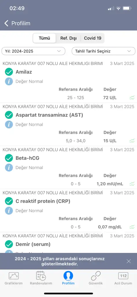 Beta-hCG değeriniz 1,20 mIU/mL ve referans aralığı 0-5 mIU/mL olarak belirtilmiş. Bu değer, genellikle gebelik olmadığı anlamına gelir.