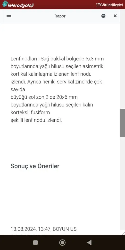 Bu siteye bu konu nedeniyle kayıt oldum bir üniversite eğitim araştırma hastahanesinde KBB ve hematoloji takip ediyor altı ay arayla ultrason çektirdim lenf nodüllerim'de büyüme yok ama küçülmede olmadı hatta antibiyotik kullandım yine geçmedi tehlikeli değil takip edelim 3 ayda bir dediler ama hastalık hastası oldum hayattan soğudum arada da küçük lenf nodülleri çıkmaya devam ediyor. Dişçiye bile gittim bu yüzden bir çürük dişim olduğu kanal tedavisi yapacaklarını diş etlerimdede problem olabileceğini ayrıca bir yirmilik dişimin çıkmaya çalıştığını söylediler acaba bundan mı geçmiyor bilmiyorum şimdi birde kuru öksürük başladı acaba psikolojik mi çünkü endişelendiğimde başlıyor ve geçiyor aşağıya ultrason sonuçlarımı ekledim sırasıyla ilk 2 raporlar altı ay öncesinden son üçünü de geçen ay çektirdim 12 kasımda yine kontrol üm var çok üzgünüm :/ ateş gece terlemesi vb. Asla yaşamıyorum yardımcı olanlara şimdiden teşekkürler