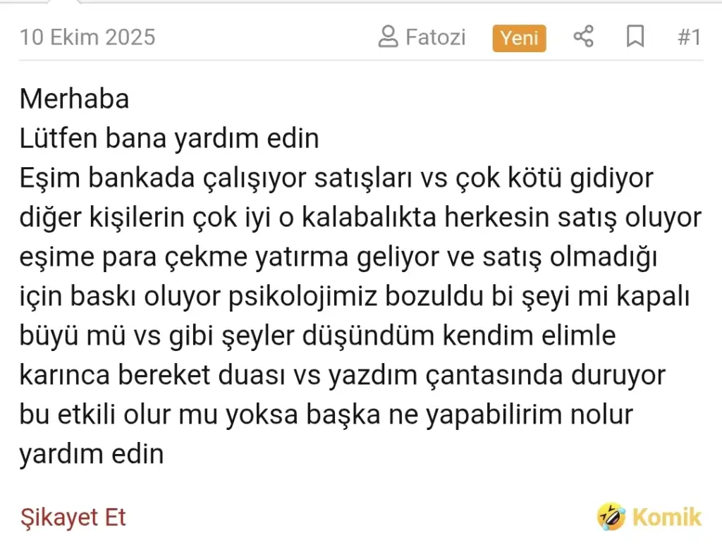 Bankada çalışan adama satış yapamama büyüsü yapmışlar kdjd ne hikmetse işten atılma büyüsü değil de satış yapamama dmdKendi eliyle yazdığı karınca bereket duası (!) belki... Kız kafan mı gidik unuttun mu banka satışı patlatmak için imiş