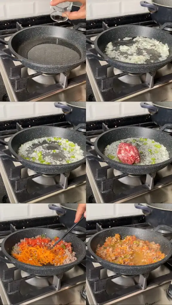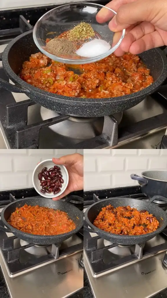 Öncelikle bolognese sostan başlıyoruz sıvı yağı ekliyoruz ardından minik doğradığımız soğan, sarımsak, biber bir güzel kavuralım. Daha sonra Kıymayı ekliyoruz ve rendelenmiş havuç ve domatesleri ekleyip karıştırıyoruz. Domateslerimiz iyice eridikten sonra salça ilave ediyoruz ve peşinden tuz karabiber ve kekik en son hazır pişmiş Meksika fasulyesinden ekliyoruz ve sosumuz hazır.