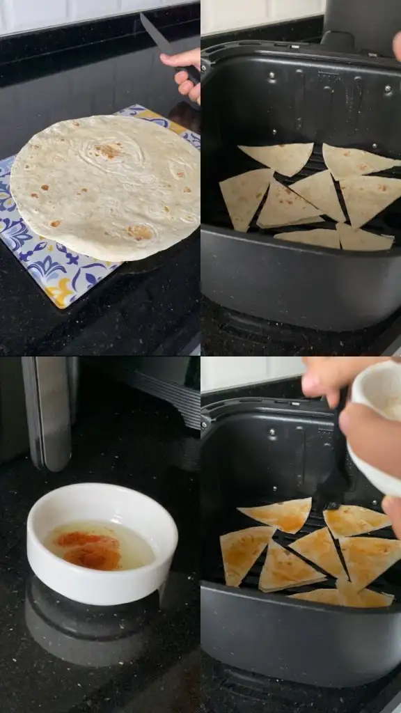 Tortilla cipsimiz için tortilla lavaş alalım ikiye bölelim ve üçgen şeklinde keselim daha sonra üstüne sürmek için zeytinyağı ve kırmızı toz biberi bir kasede karıştıralım ve üzerine sürelim ve fırınlayalım 190 derecede kızarınca hemen çıkaralım.