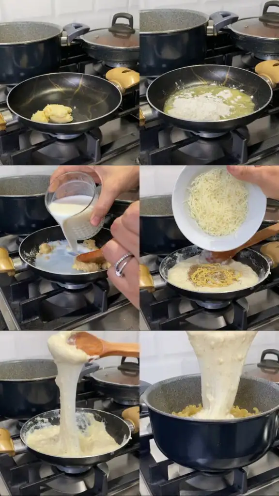 Beşamel sosumuz için tereyağını eritelim üstüne un ekleyip karıştıralım daha sonra yavaş yavaş sütümüzü ekleyelim çok katı olursa ekleme yapabilirsiniz sütten. Daha sonra üzerine karabiber hardal ve rendelediğimiz kaşarı ekleyelim ve karıştıralım.