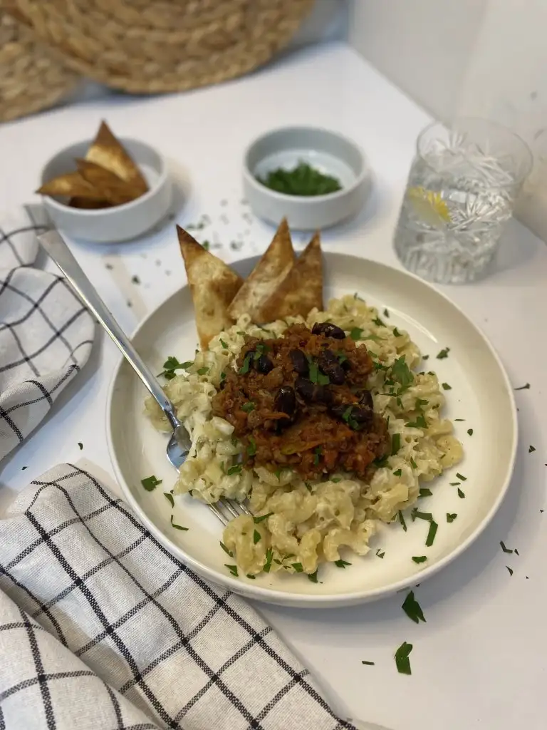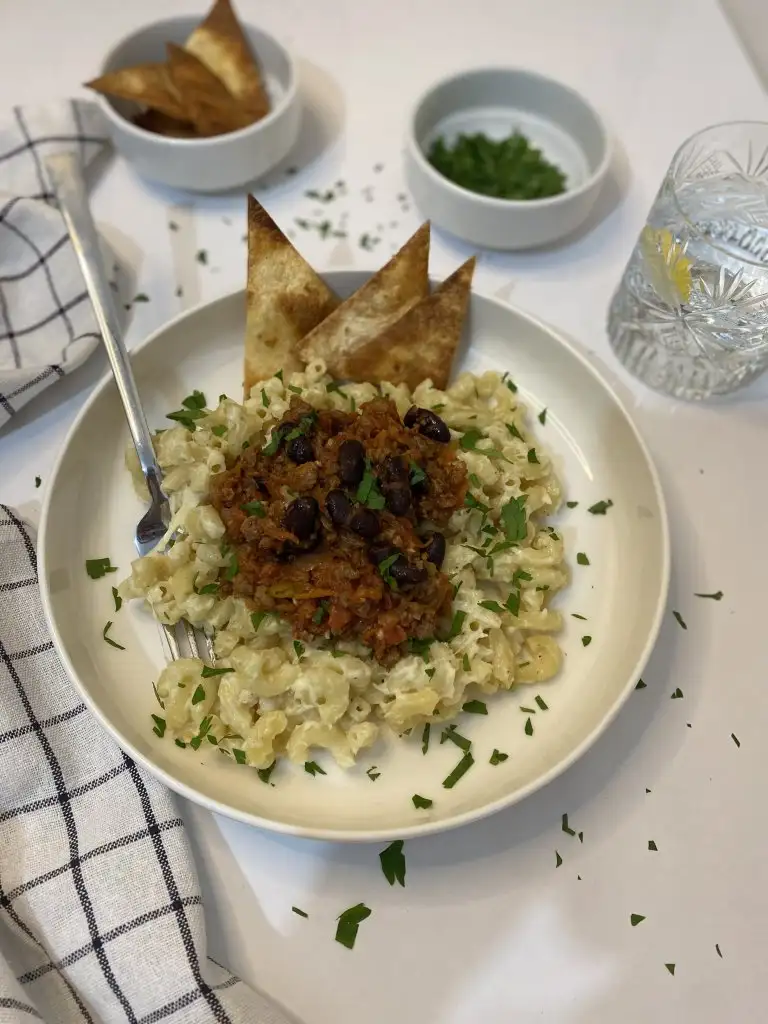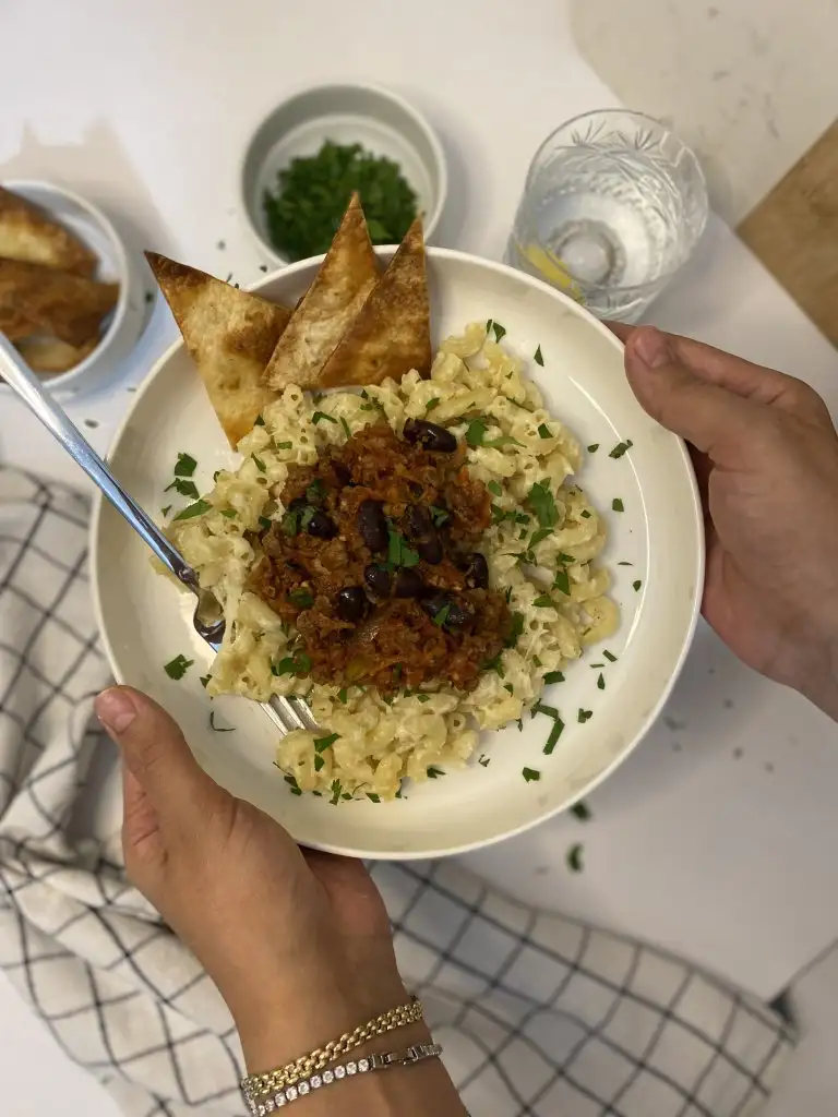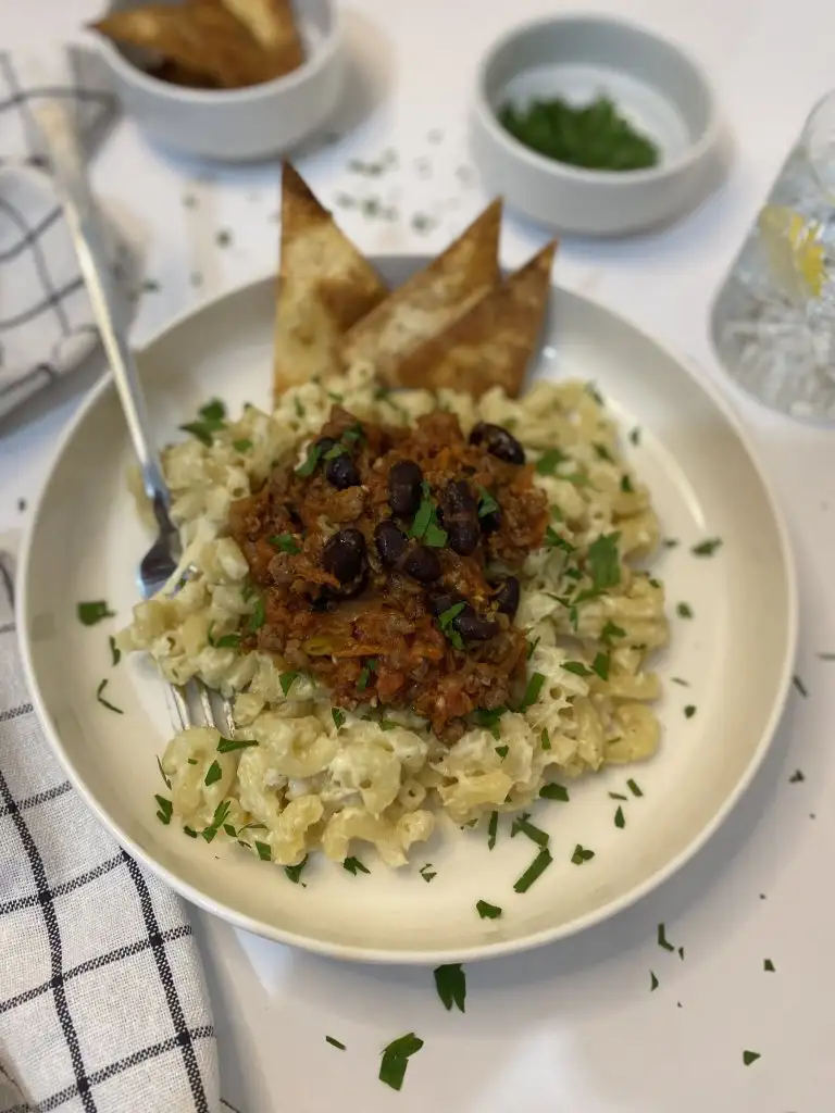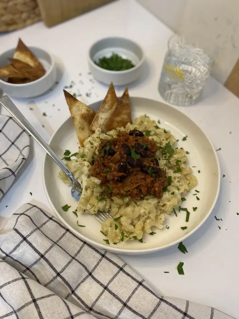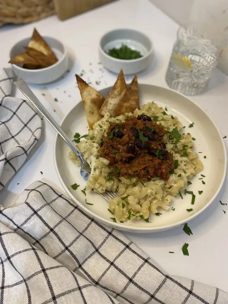 Makarnamızı haşladıktan sonra beşamel sosumuzu makarnanın üzerine döküyoruz ve karıştırıyoruz. Uygun bir servis tabağında makarnamızı ekleyip üzerine bolognese sostan dökelim. Hazırladığımız tortilla cips ile bolognese sosumuzdan kaşıklayıp yiyebilirsiniz ve unutmadan sıcak yemelisiniz ☺️. Ve Yemeğimiz hazır❣️🥳