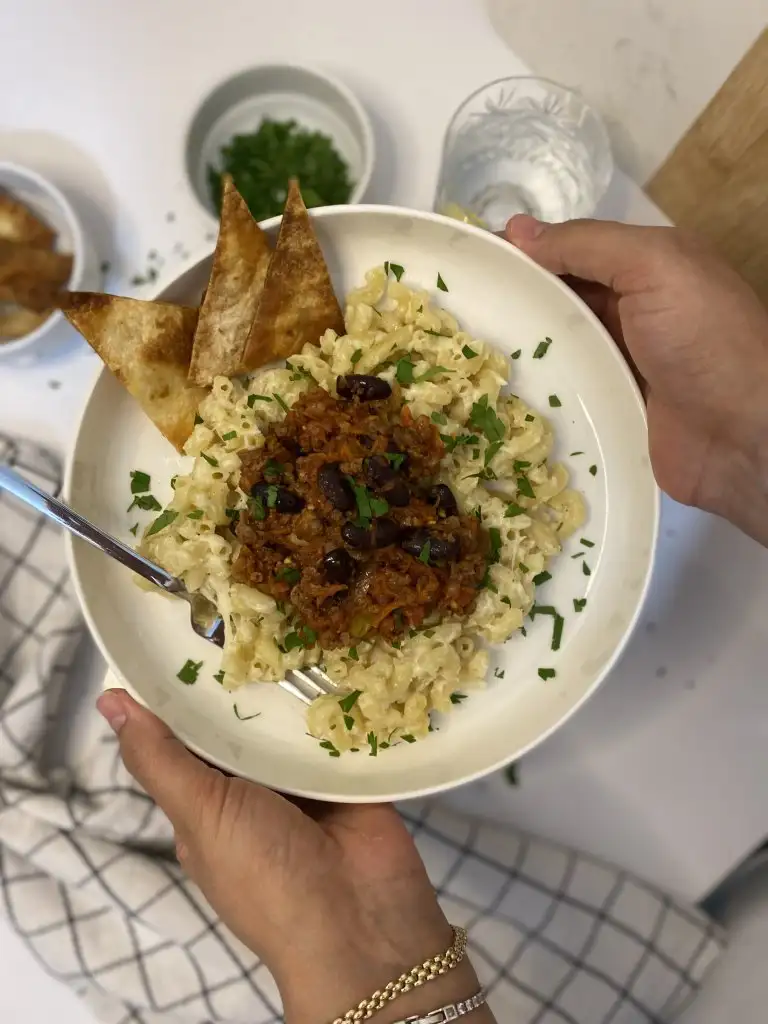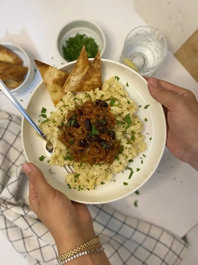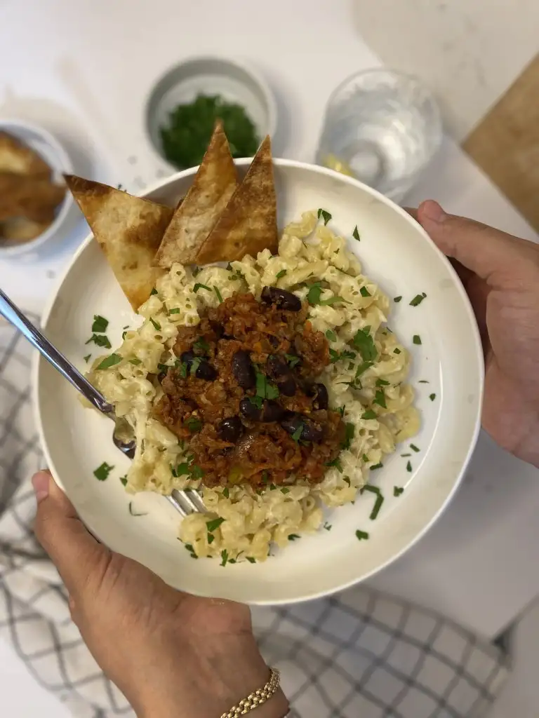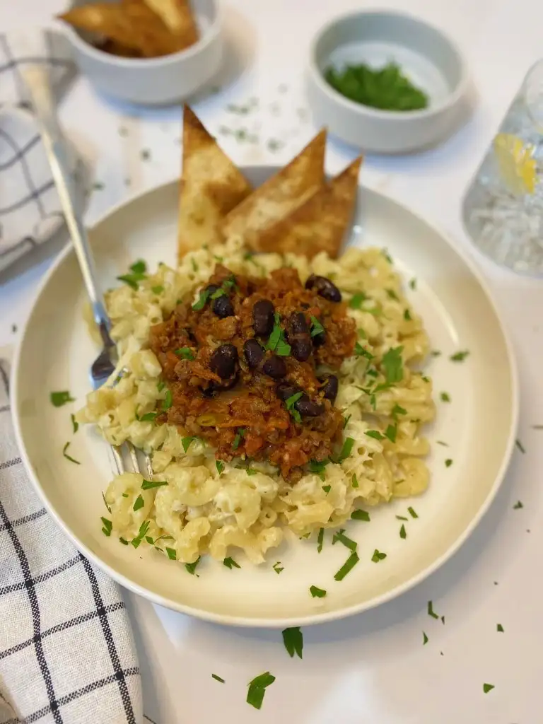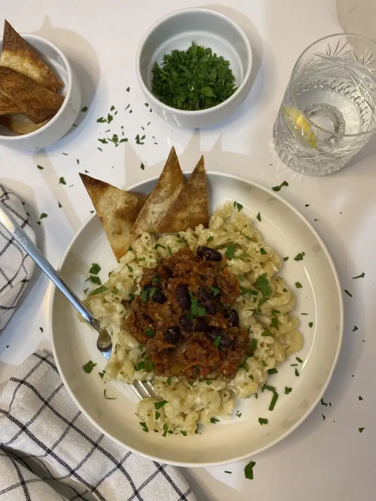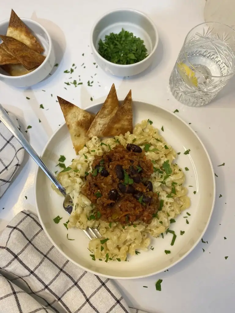 Makarnamızı haşladıktan sonra beşamel sosumuzu makarnanın üzerine döküyoruz ve karıştırıyoruz. Uygun bir servis tabağında makarnamızı ekleyip üzerine bolognese sostan dökelim. Hazırladığımız tortilla cips ile bolognese sosumuzdan kaşıklayıp yiyebilirsiniz ve unutmadan sıcak yemelisiniz ☺️. Ve Yemeğimiz hazır❣️🥳