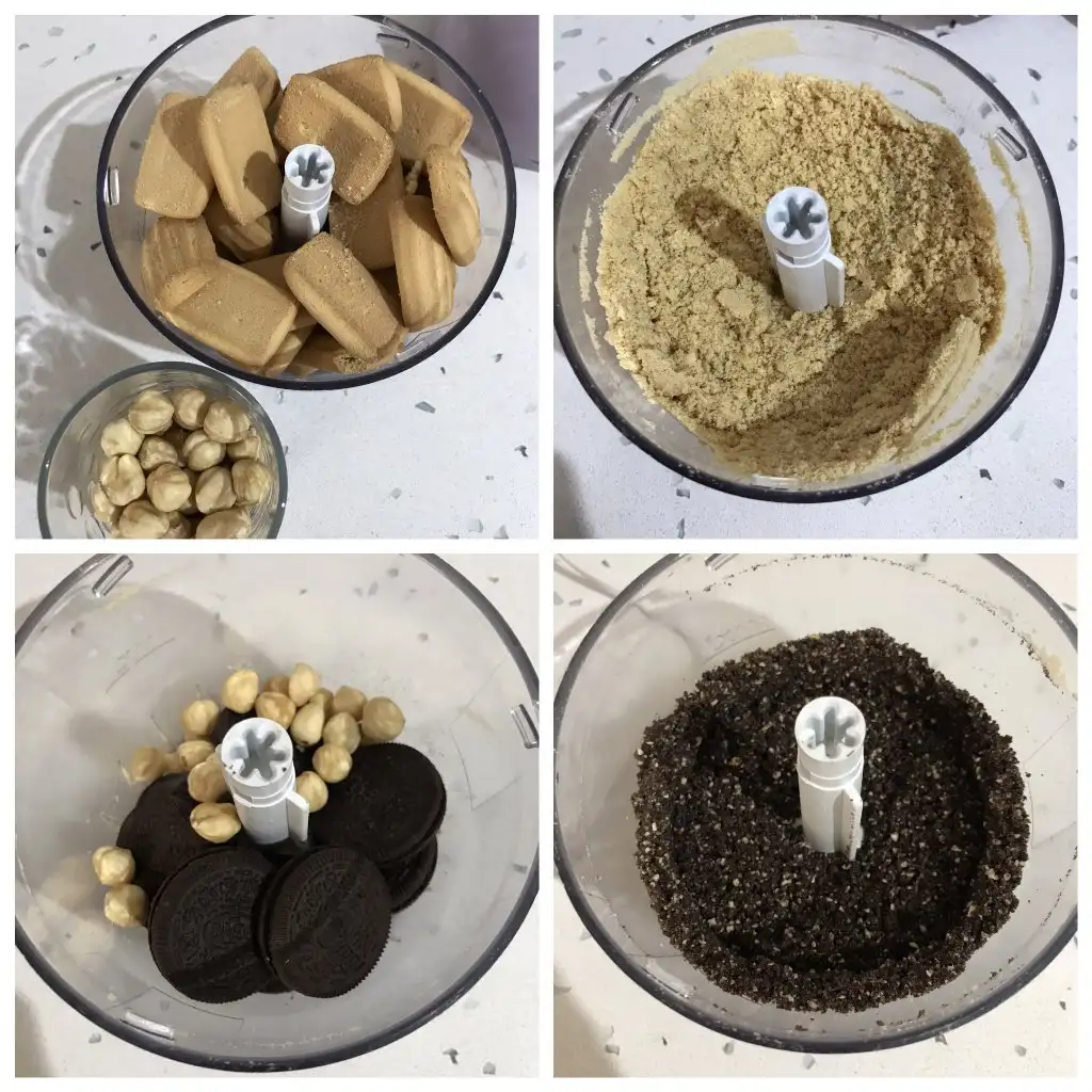 Blenderda fındığın birazını ve bebe bisküvisini cırtlatıyoruz. Daha sonra oreo ile fındığın kalan kısmını da blenderdan geçiriyoruz.