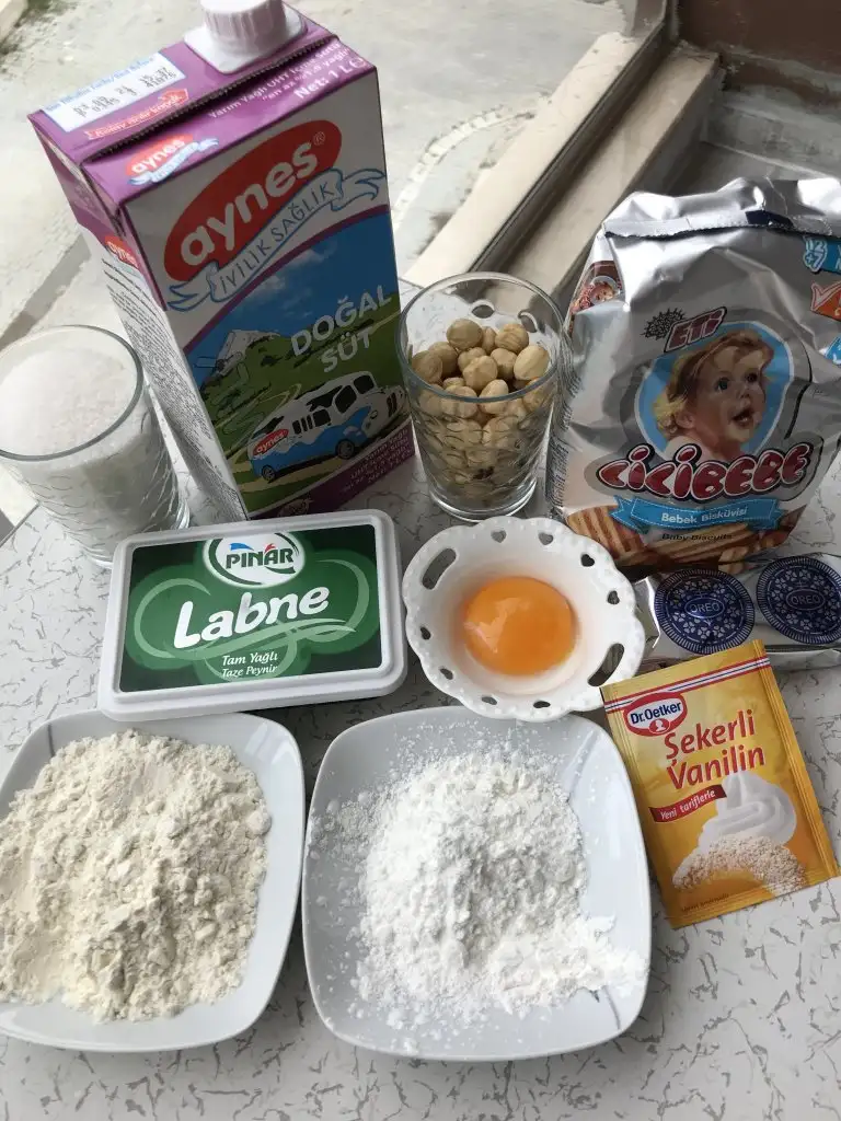 süt, un, nişasta, yumurta ve şekeri karıştırıyoruz. Muhallebimiz Göz göz olup pişince ocaktan alıyoruz ve soğuması için başka bir kaba döküp üzerine streç film seriyoruz. Soğuyan muhallebiye vanilya ve labnemizi koyup güzelce karıştırıyoruz.