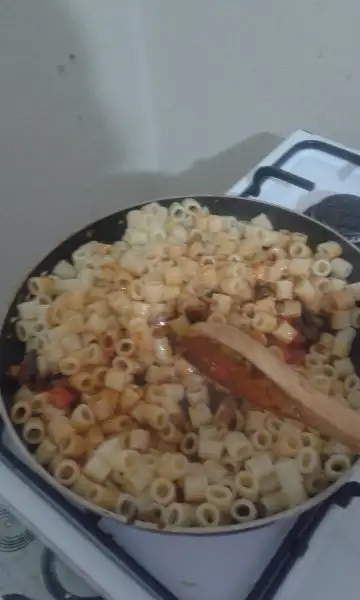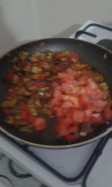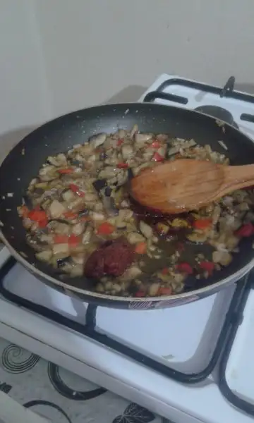 Daha sonra soğanımızı ve biberi ekliyoruz, kavurmaya devam ediyoruz en son da mantarımızı ekleyip iyice kavurmasını bekliyoruz.Sonra biber ve domates salçamızı, karabiberimizi ve tuzumuzu ekliyoruz karıştırıyoruz.En son da küp doğradıgım domatesi ilave edip biraz çevirip makarnadan ayırdıgım yarım çay bardağı suyu da ilave edip domateslerin pişmesini bekliyoruz.
