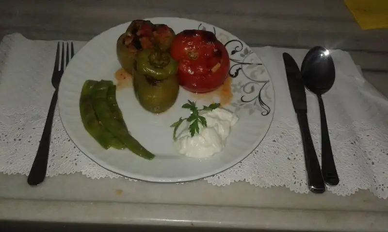 Bu işlemden sonra kaşık yardımıyla dolmalık biberimiz ve içini oyduğumuz domatesi doldurup,üzerine çok az margarin ekleyerek, tepsiye biraz salçalı su da ekleyerek yakaşık yarım saat fırına vererek pişiriyoruz.