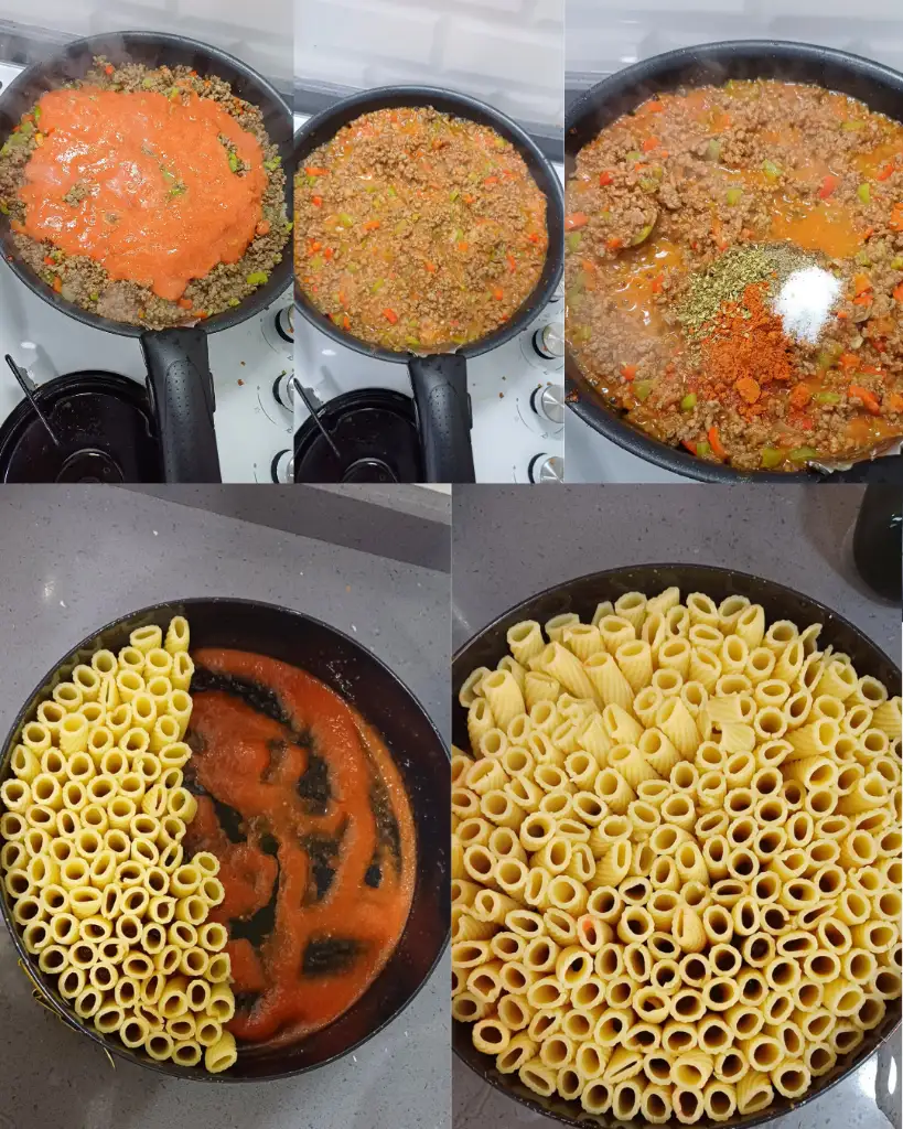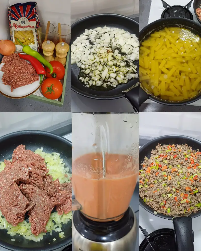 4. Ben domatesleri blenderdan geçirerek domates suyu elde ettim. Domates suyunun bir kısmını da kıyma ekleyip biraz su çekinceye kadar kavuralım. Baharatlarını da ilave edip altını kapatalım.