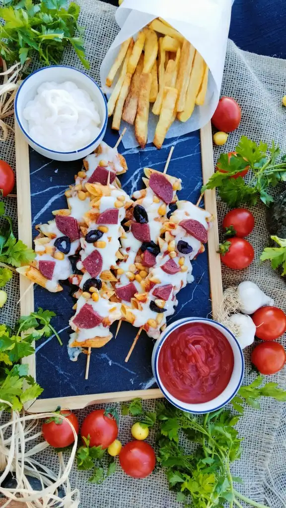 Doğradığımız sucukları diziyoruz. Zeytin ve mısırları ekleyip 180 derecede 10-15 dk pişiriyoruz. Kaşar eriyip sucuklar pişince servise hazır