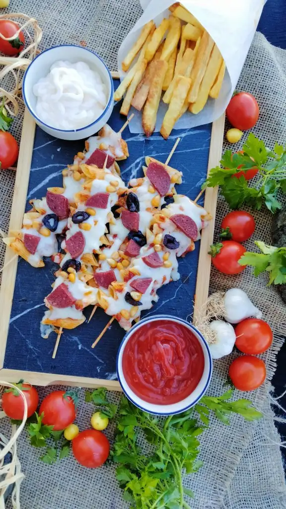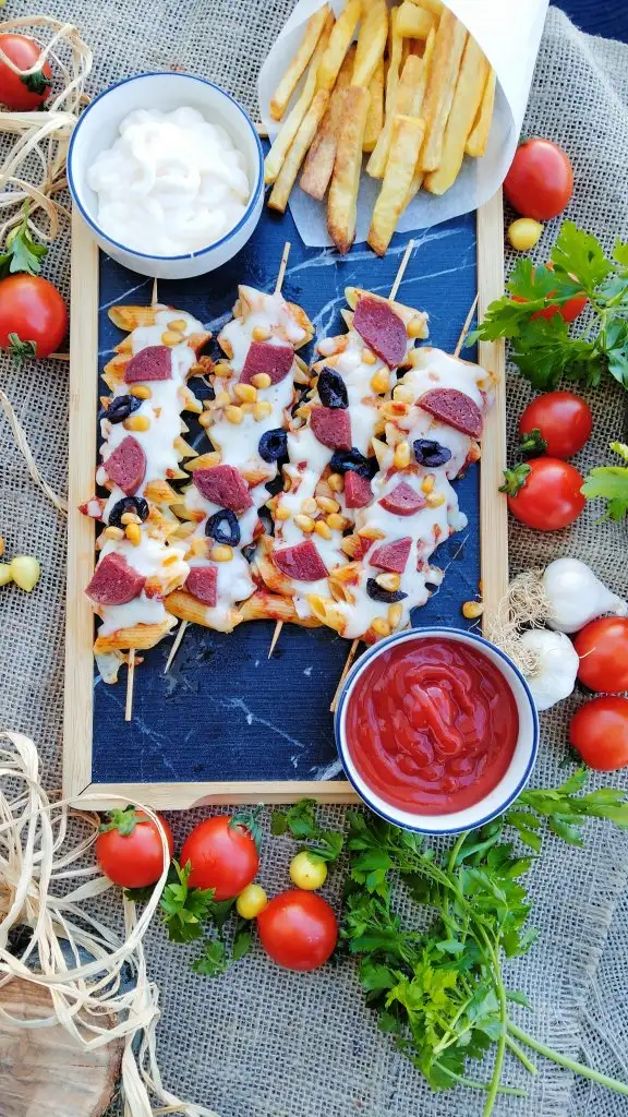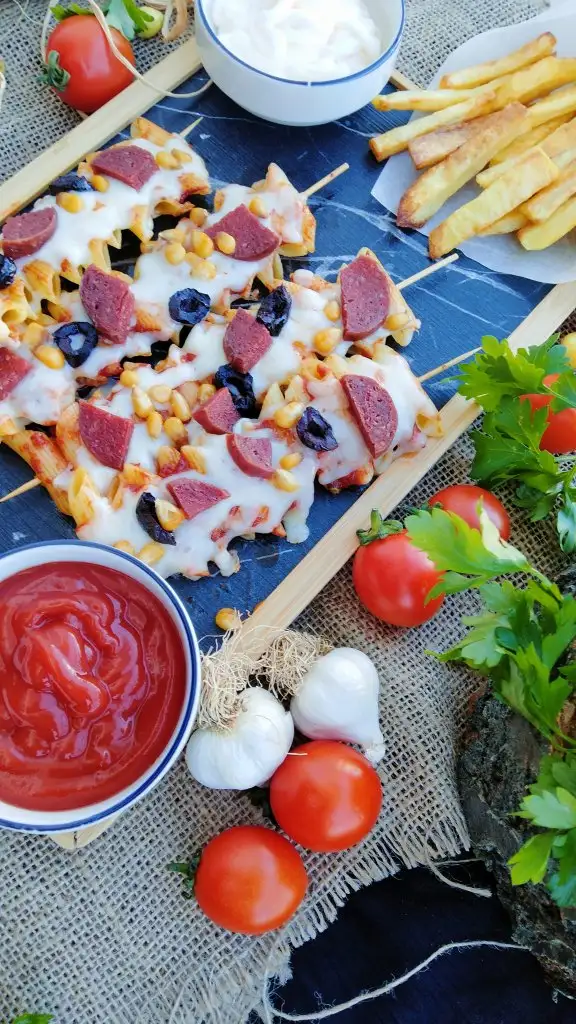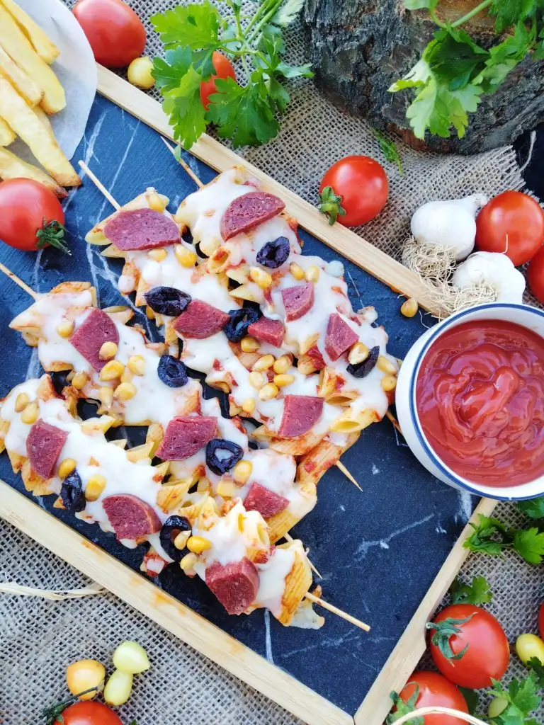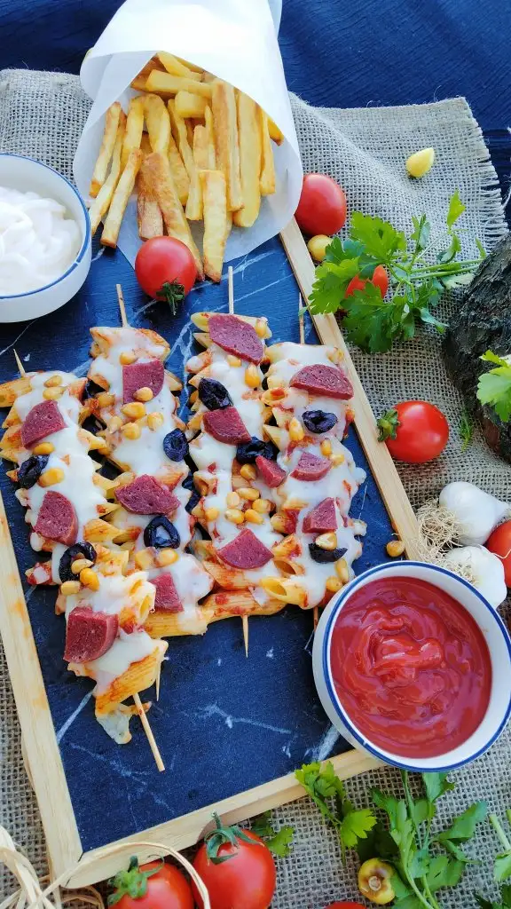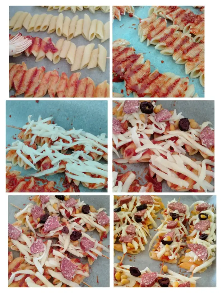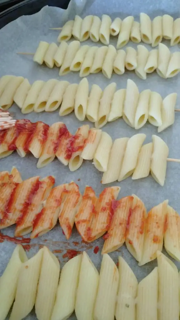 Soğuyan makarnamızı çöp şişlere 13-14 tane birleşik şekilde dizip pişirme kağıdı serdiğimiz tepsiye koyuyoruz.