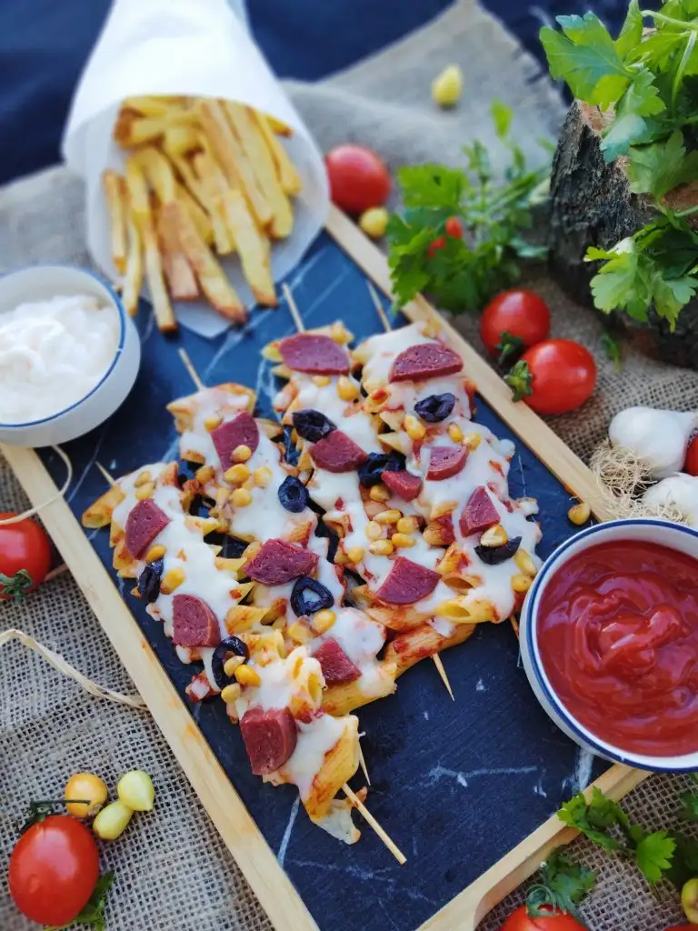 Öncelikle makarnamızı paketin arkasındaki tarife göre pişiriyoruz. Aldante ile normal arası sürede yani 10 dk yeterli olur. Haşlanan makarnamızı süzüyoruz ve mutlaka soğuk su ile yıkıyoruz. Bu yapışmasını engelliyor. Kolay şişlere takacağız.