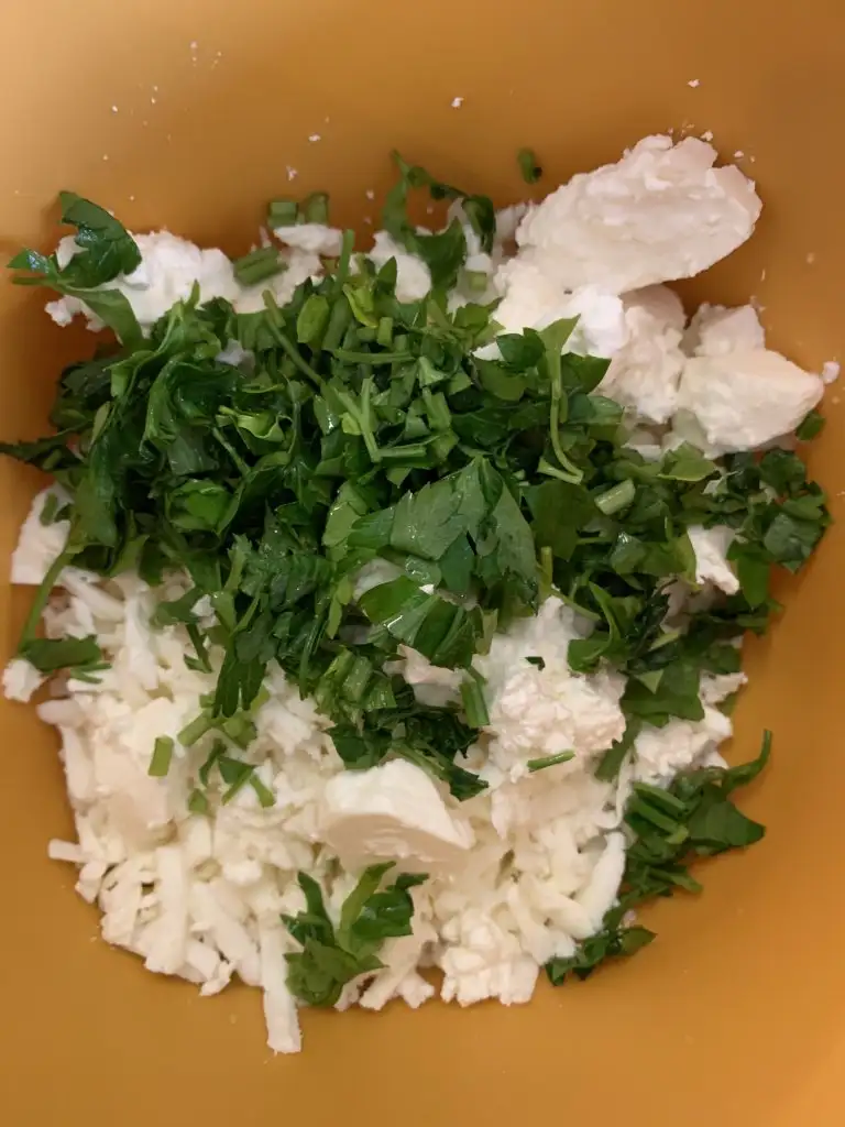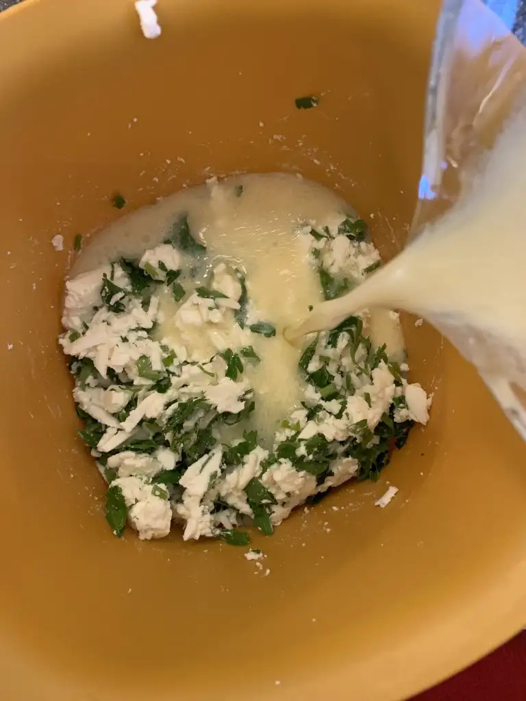 - İç harcı için,1 büyük kase peynirli maydanozlu harcımızı da ekleyip tekrar karıştıralım.