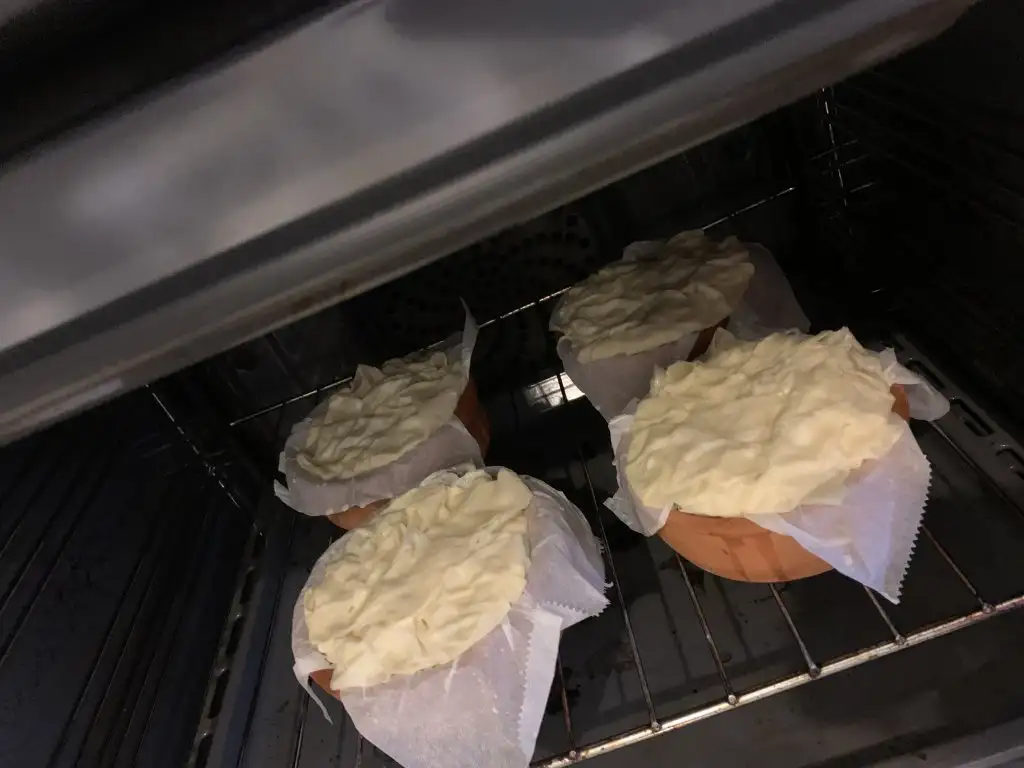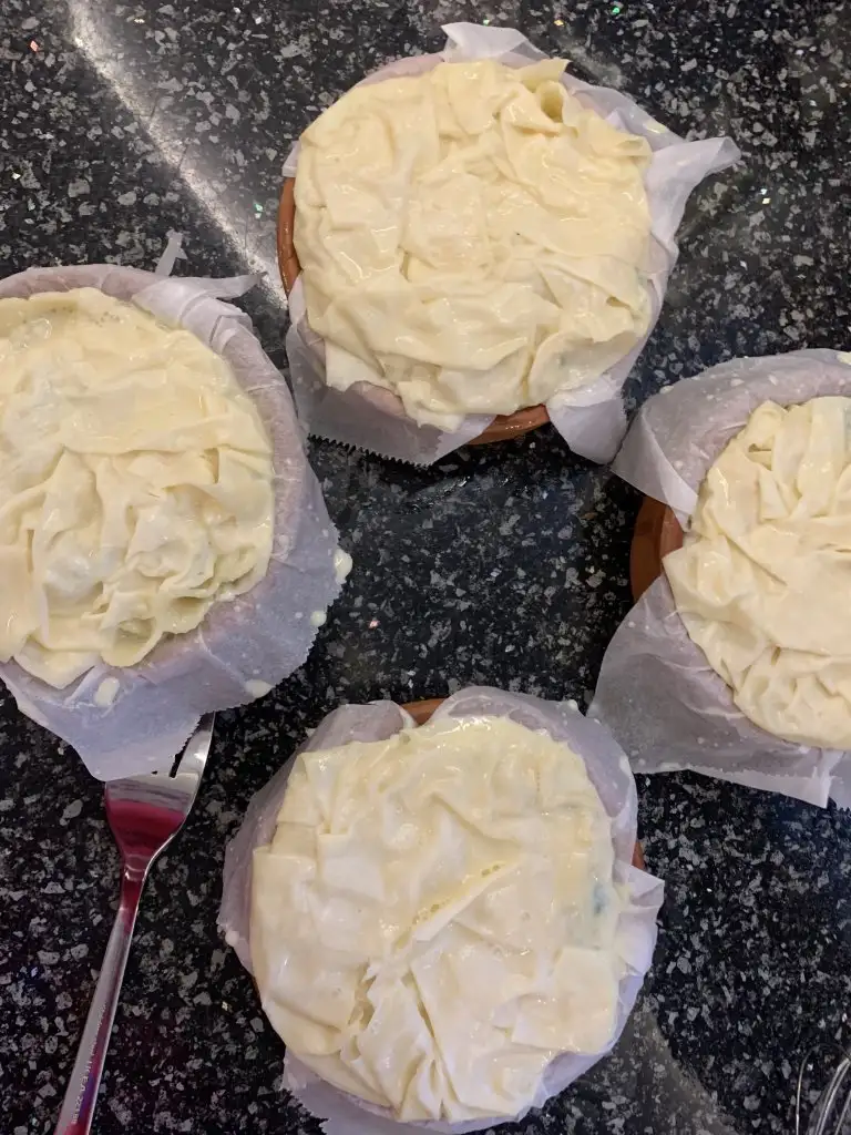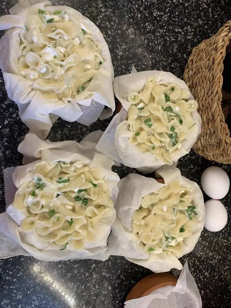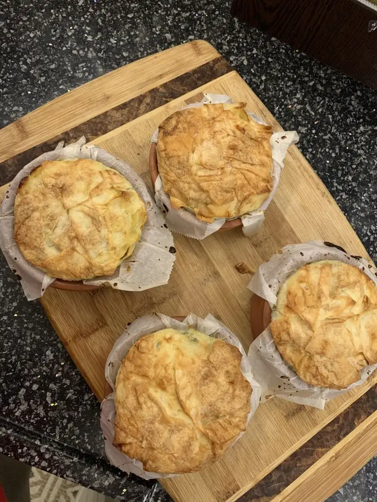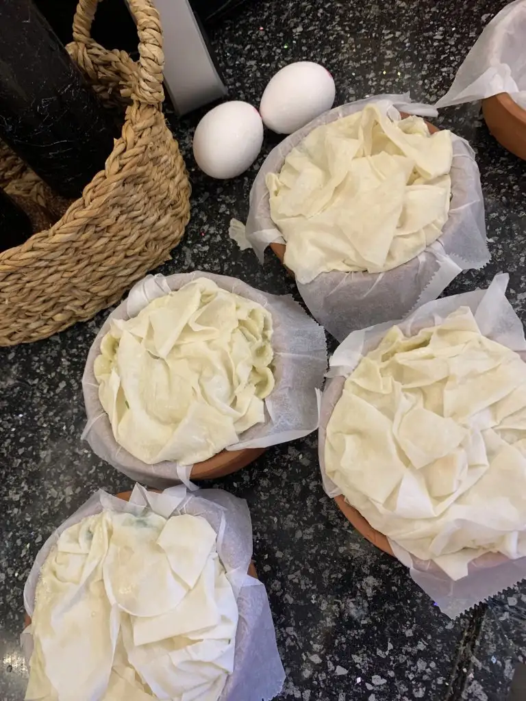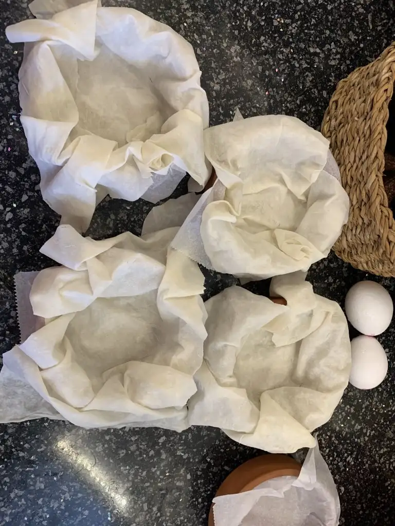 - Yağlı kağıt yaptığım güveçlere 3 adet yufkamız dan birinci yufkamızı kenarlarından taşacak şekilde yerleştirelim. Güveçlere olacak sekılde küçük yaptım ben.